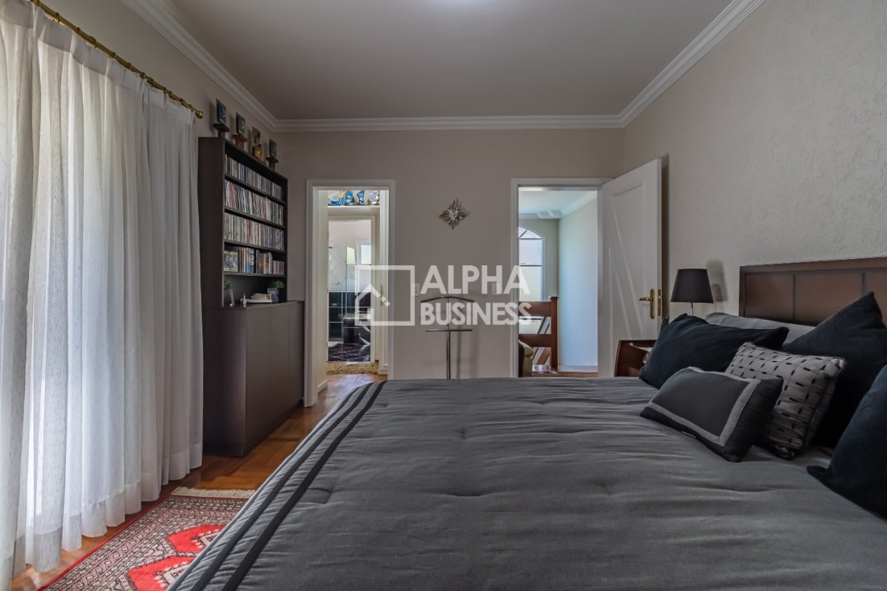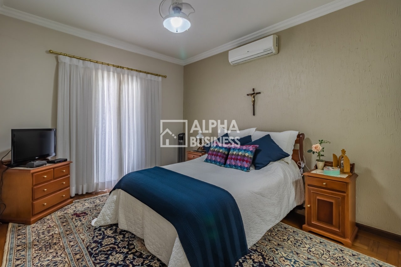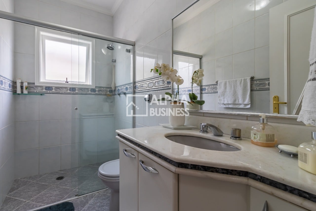 A propriedade possui garagem para dois carros e um quarto de empregada com banheiro privativo, proporcionando acomodação confortável para a equipe doméstica.