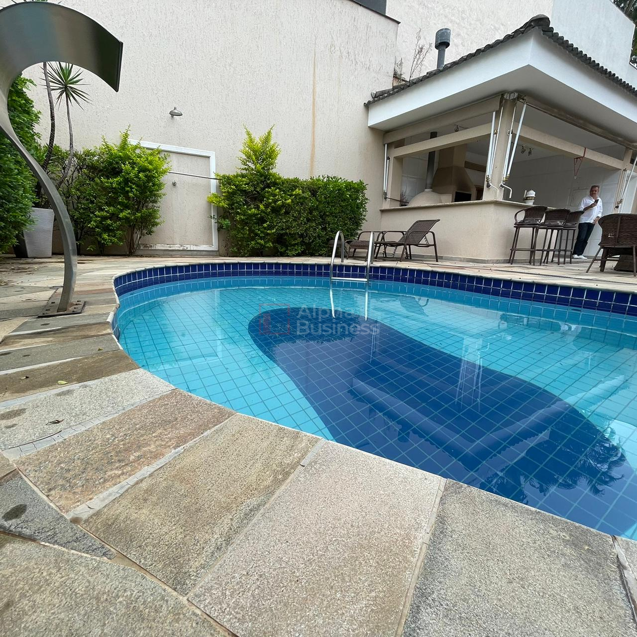 Excelente casa em Alphaville, com 450m² de construção, 4 suítes sendo a master com closet e hidromassagem, repleta de armários, ar-condicionado, sala íntima, ampla sala com lareira e varanda, jardim de inverno, escritório, cozinha planejada, despensa, sala de almoço, espaço gourmet com churrasqueira e forno de pizza, e piscina aquecida com cascata. Conta com 4 vagas de garagem.