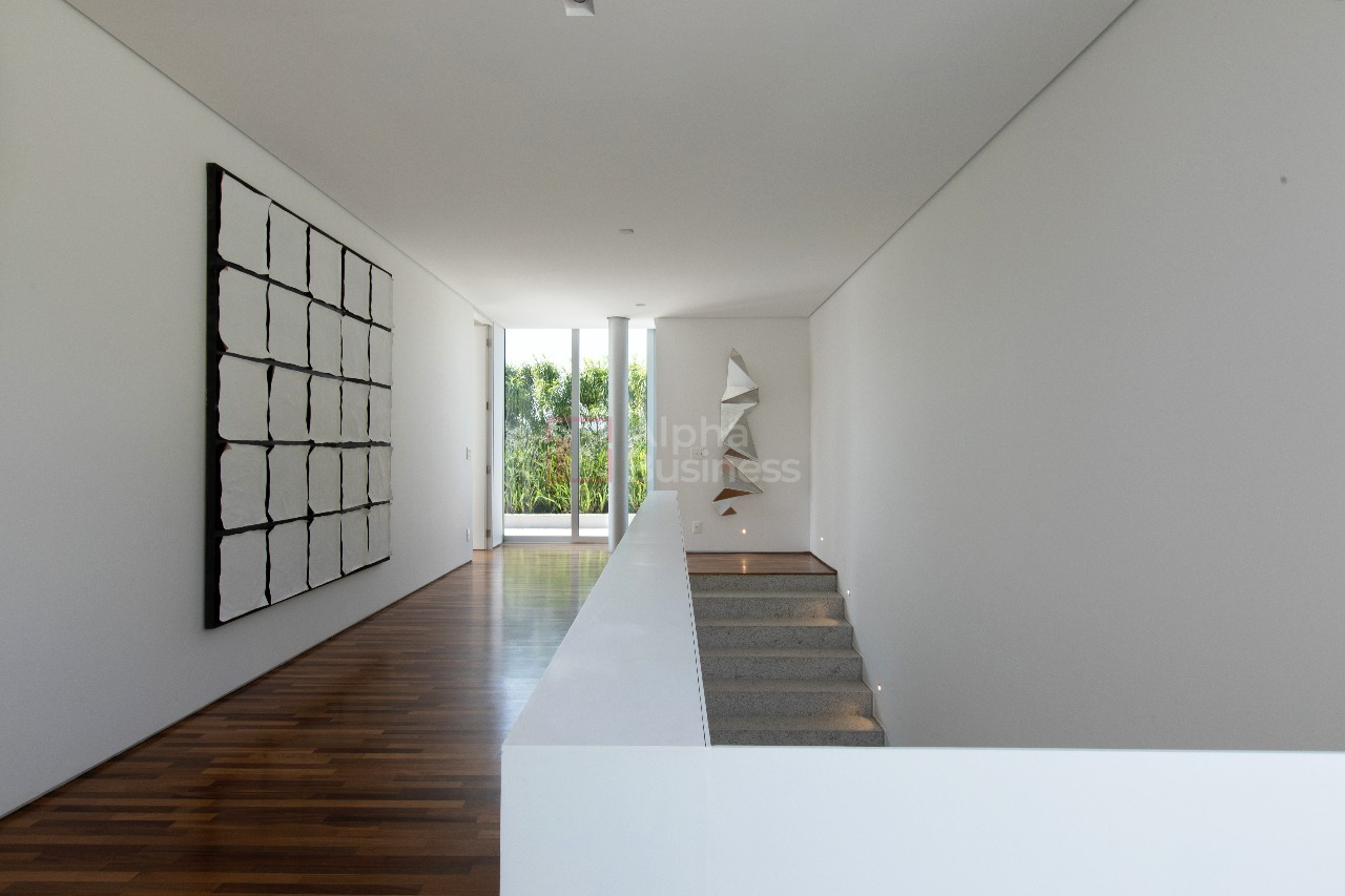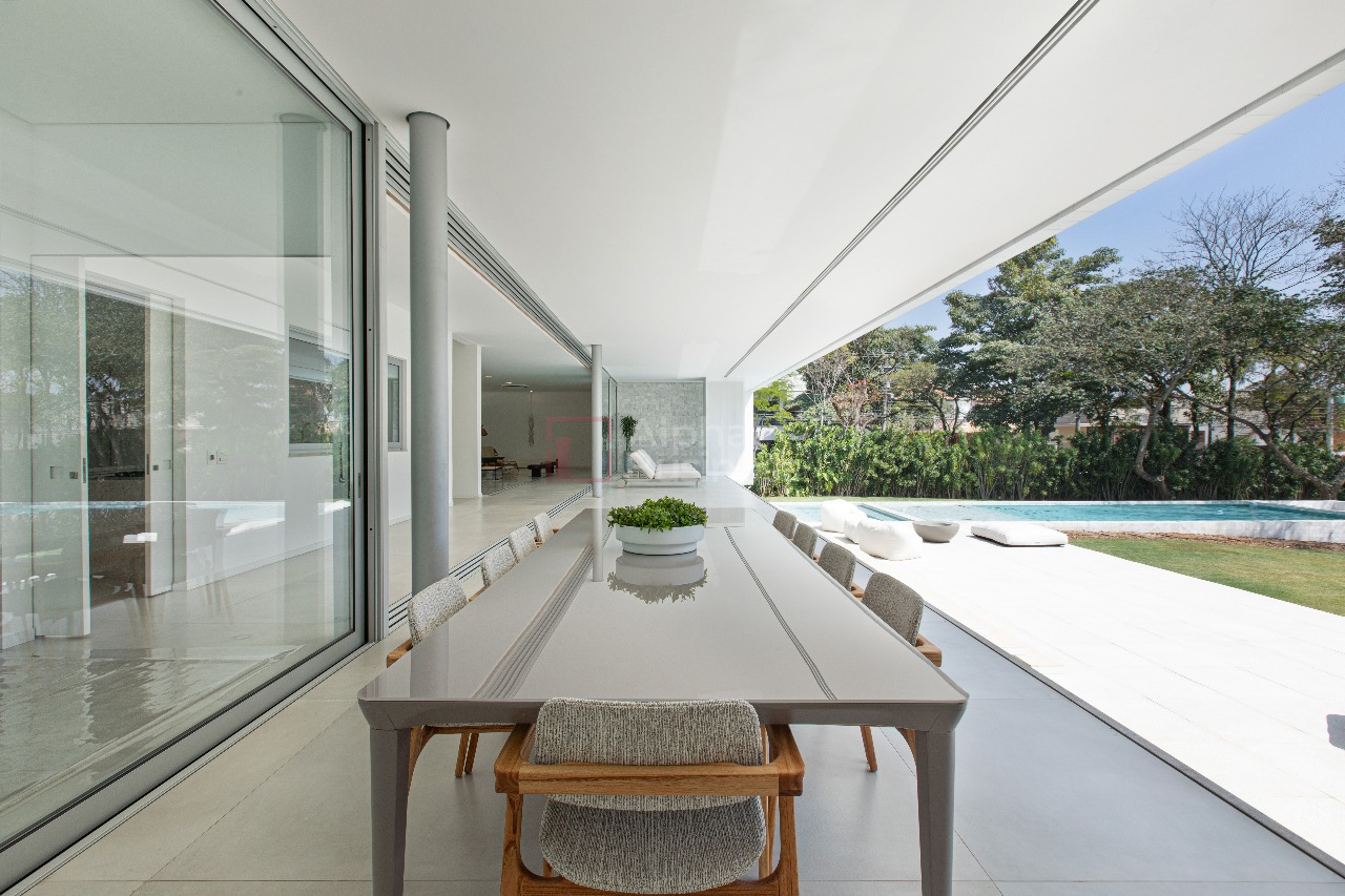 Um feito técnico que, além de instigar a curiosidade sobre sua sustentação, contribui para a sensação de flutuação. A luz natural é protagonista entra, rebate e se move nos planos brancos da casa, criando variações sutis ao longo do dia.