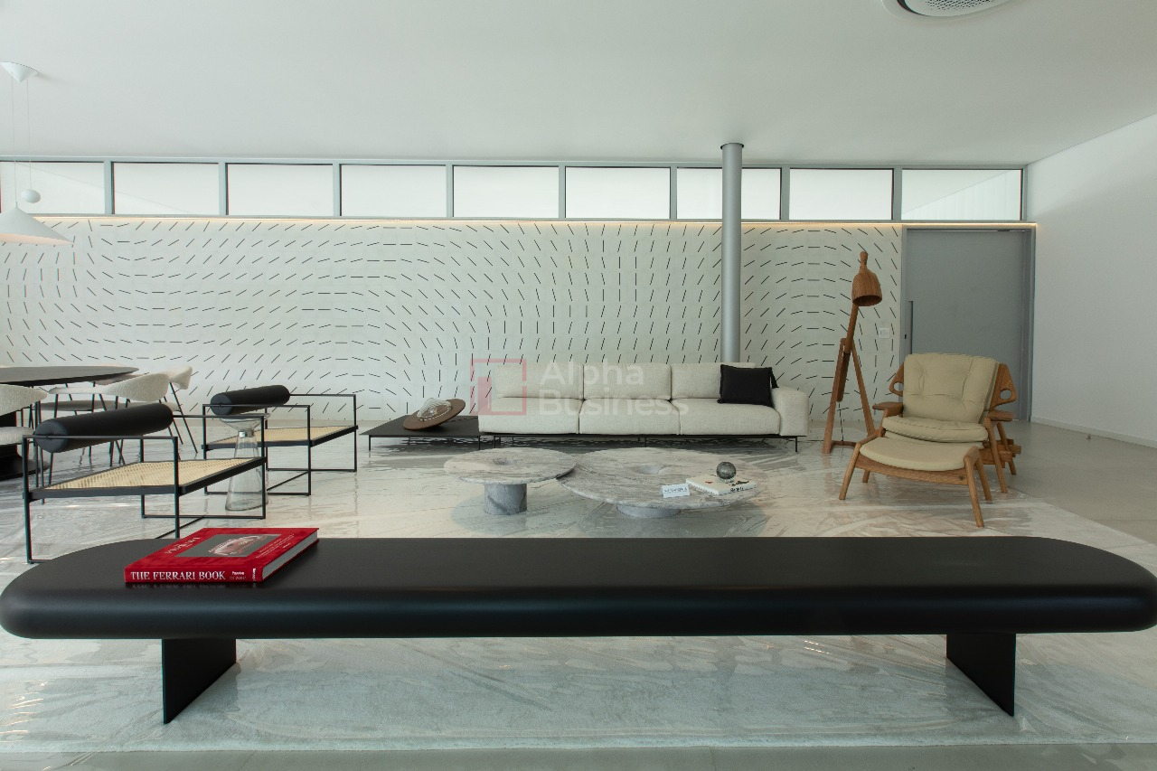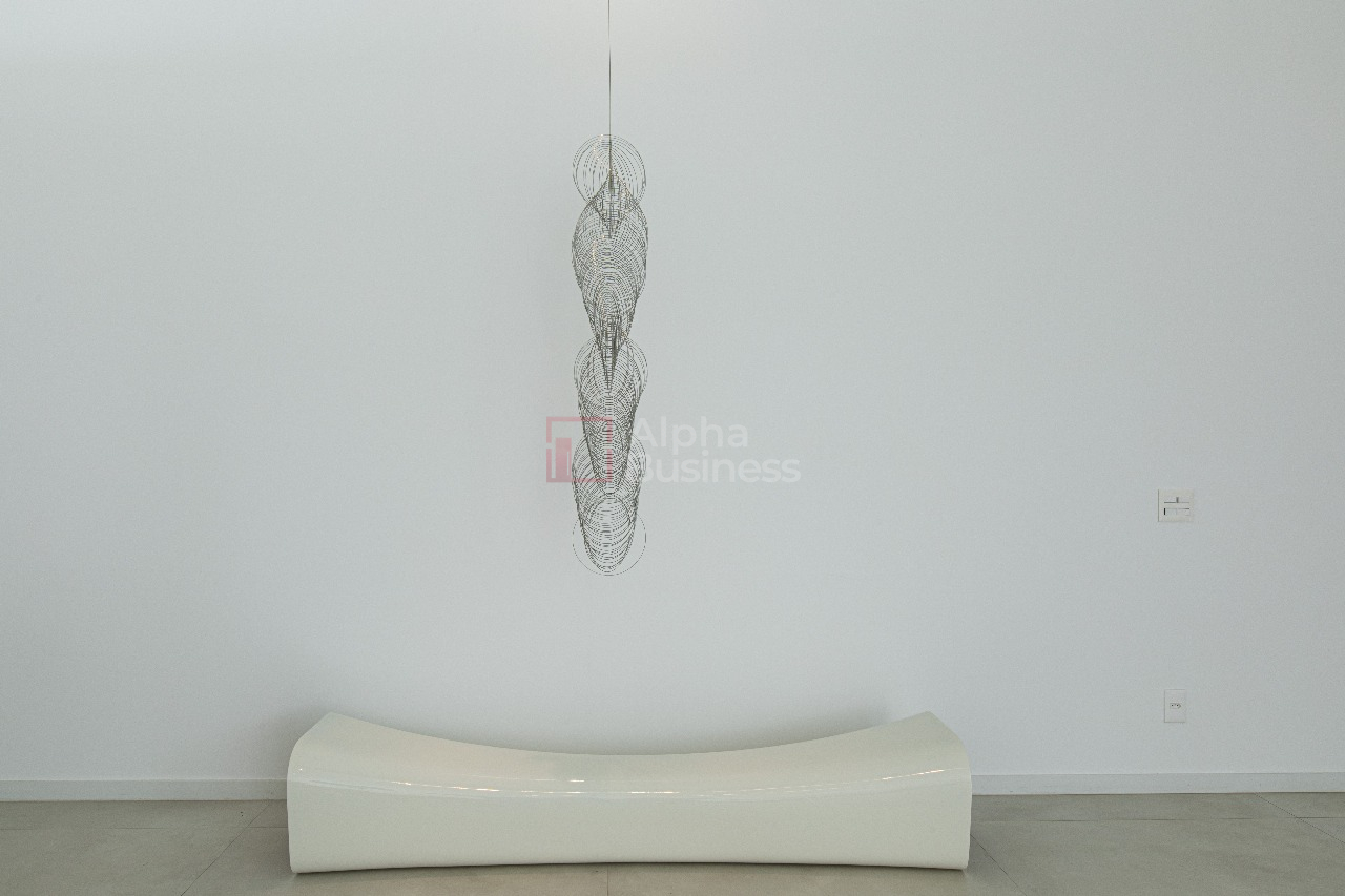 O conceito de movimento também é traduzido na arte. O mural assinado por João Nitsche parte de um módulo simples, um segmento de reta que, conforme se expande, gera composições geométricas que dançam aos olhos próximas, abstratas; distantes, fluidas. Uma obra viva, que reforça o diálogo entre arquitetura e arte.