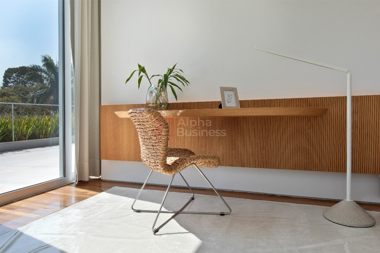 A leveza não está apenas no conceito, mas também na execução. A estrutura metálica e as divisórias de madeira laminada colada garantem um volume cinco vezes mais leve do que uma construção convencional em alvenaria, com mínimo impacto ambiental durante a obra.