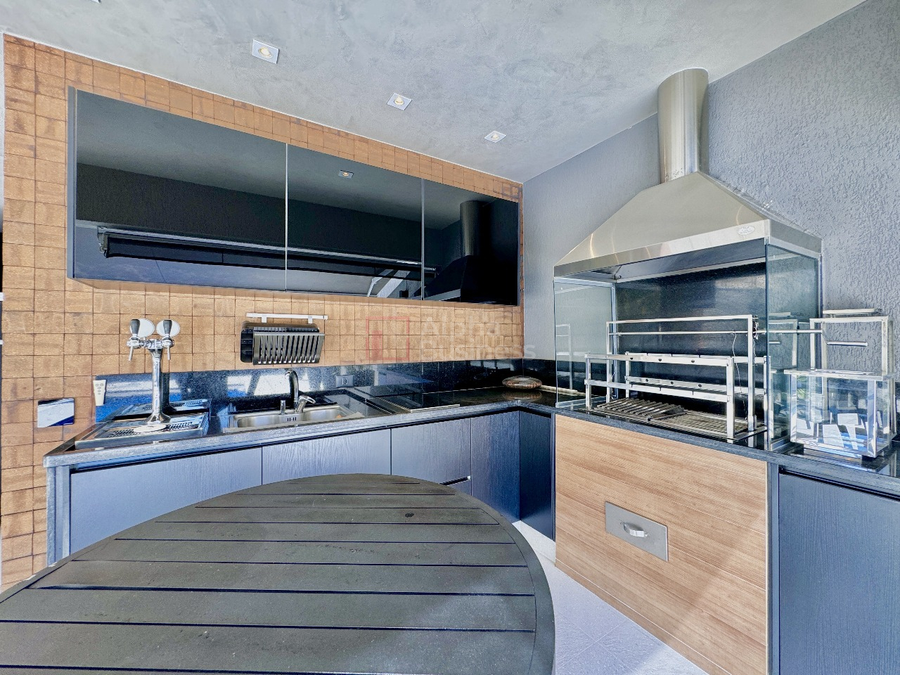 Área gourmet com churrasqueira, balcão com chopeira e sauna