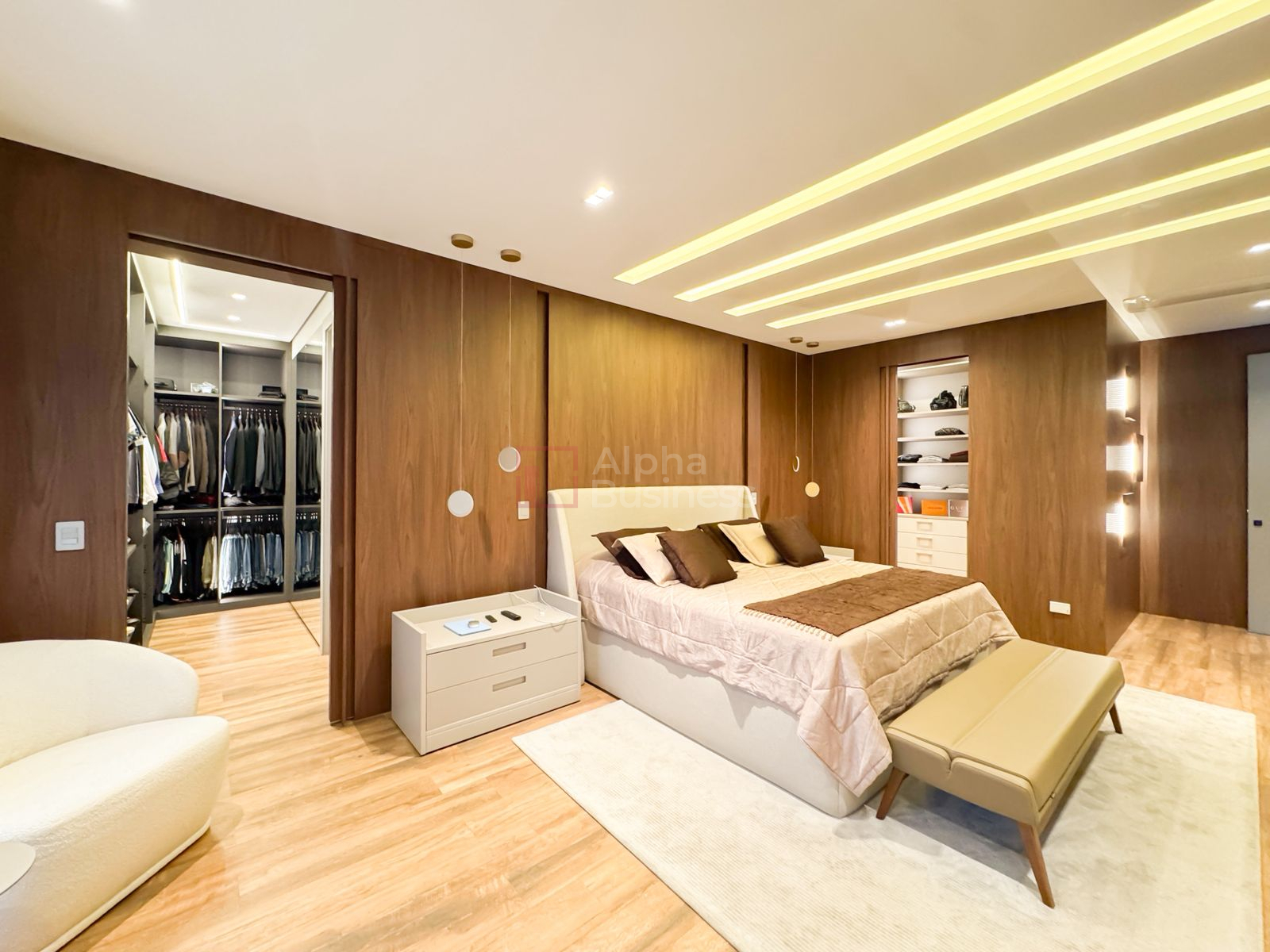 • 5 suítes (incluindo: suíte master com closets Sr. e Sra. e banheiro com divisão interna, banheira e revestimentos nobres)