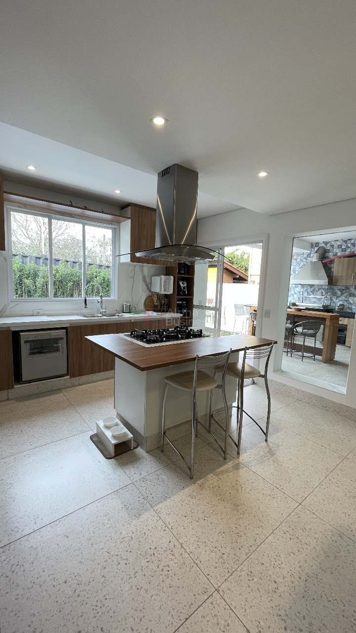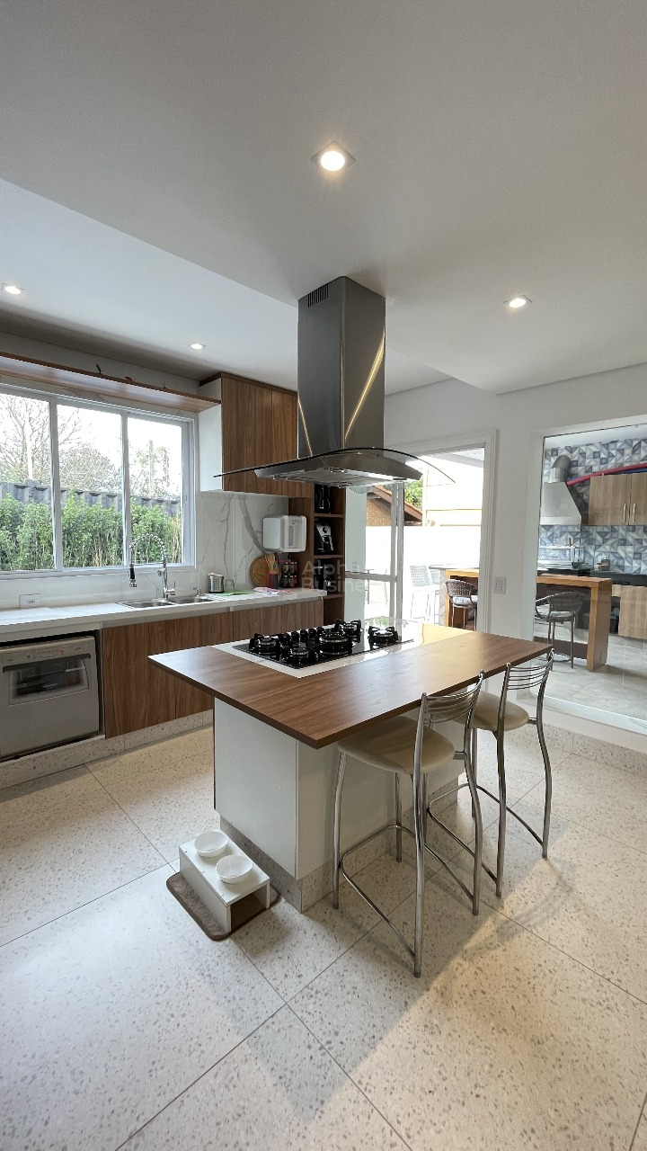 Ilha com cooktop e coifa, bancadas, forno, armários planejados