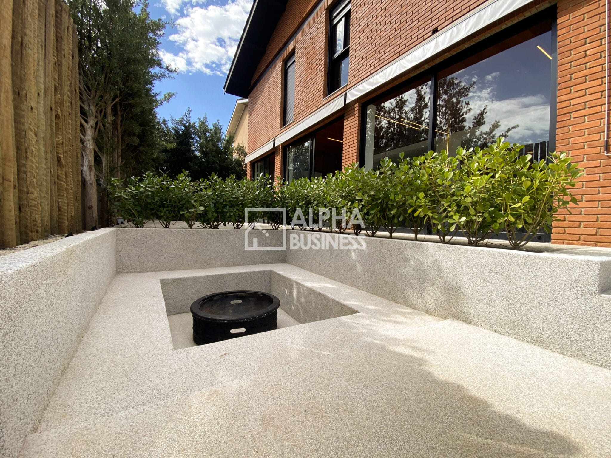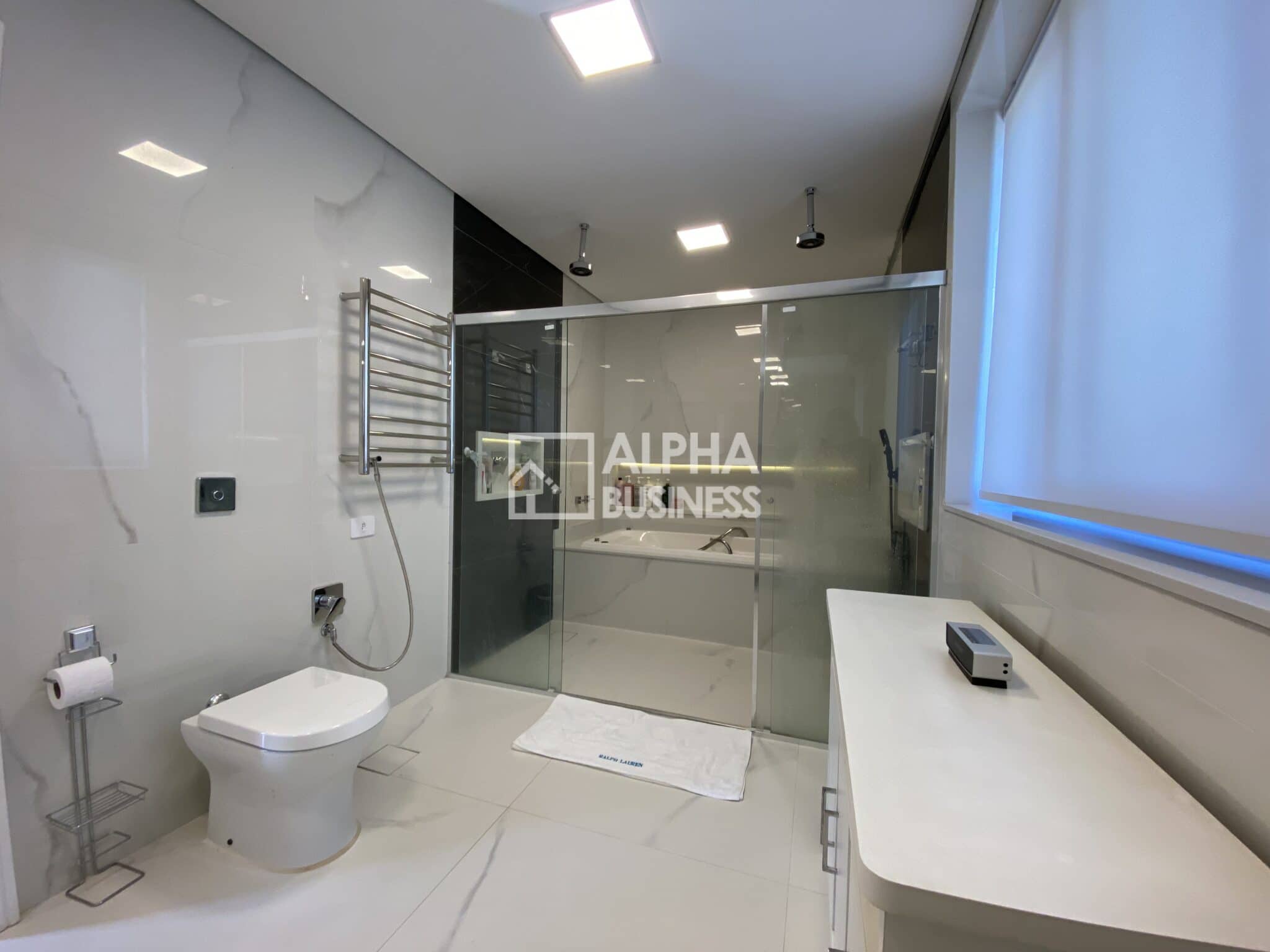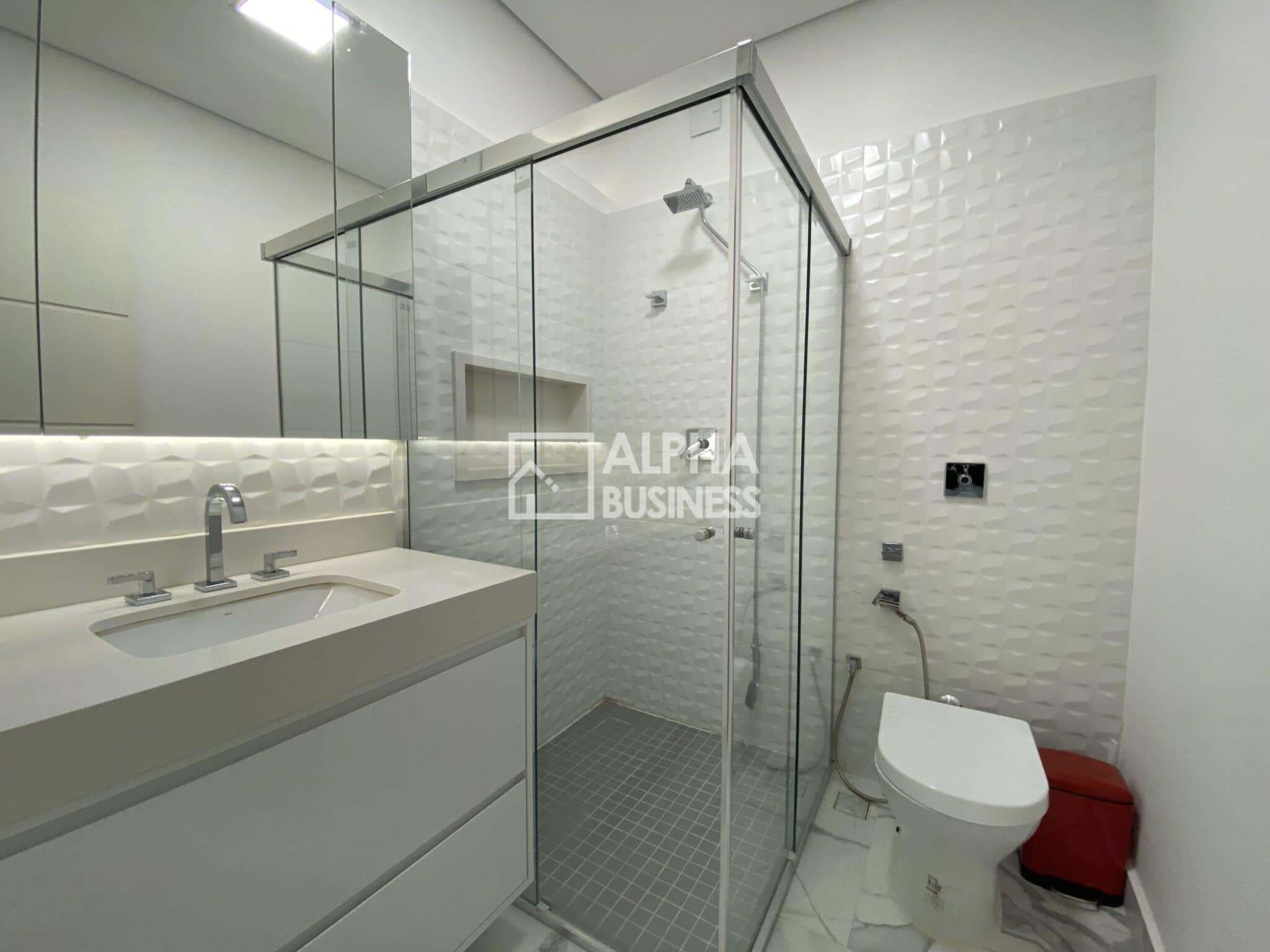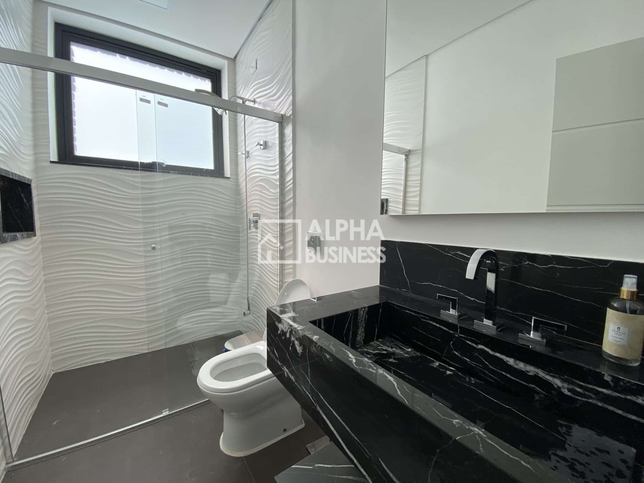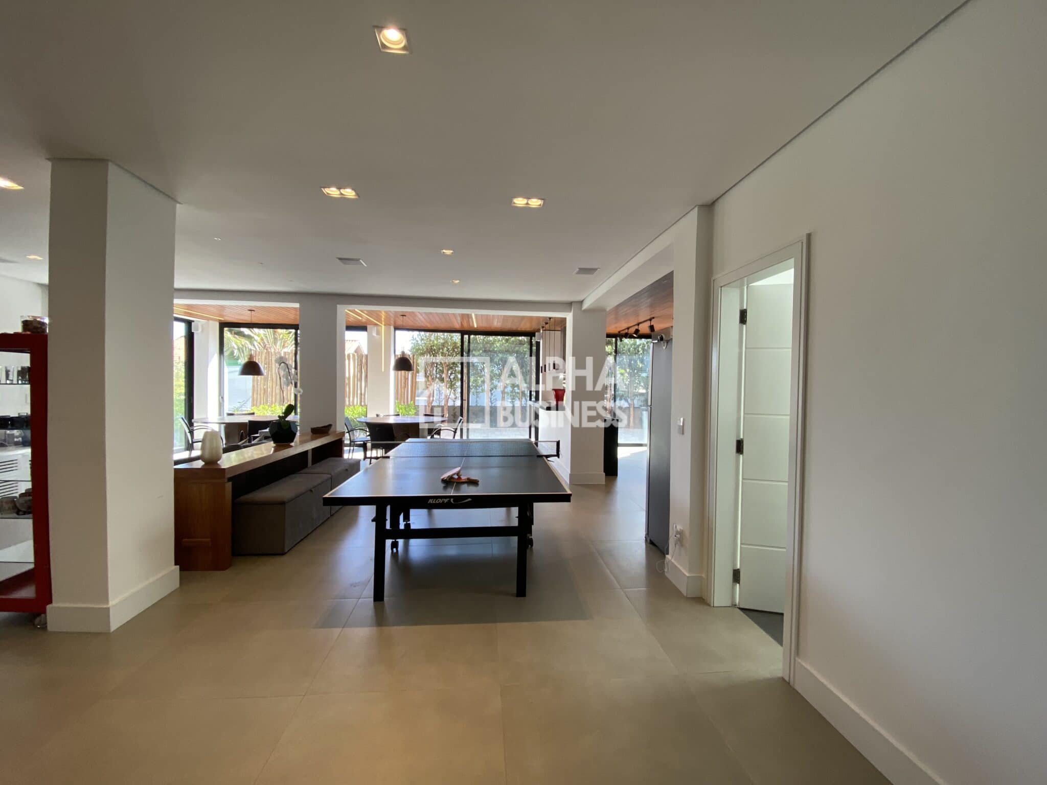 No total, a casa possui 4 suítes, sendo que a suíte master conta com closet e um amplo banheiro. O piso inferior da casa foi destinado à área de lazer, que inclui uma área fechada de churrasqueira com uma cozinha gourmet completa, sala de jogos, banheiros, uma área de piscina ensolarada e até mesmo um fire place.