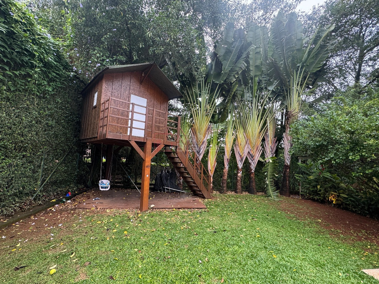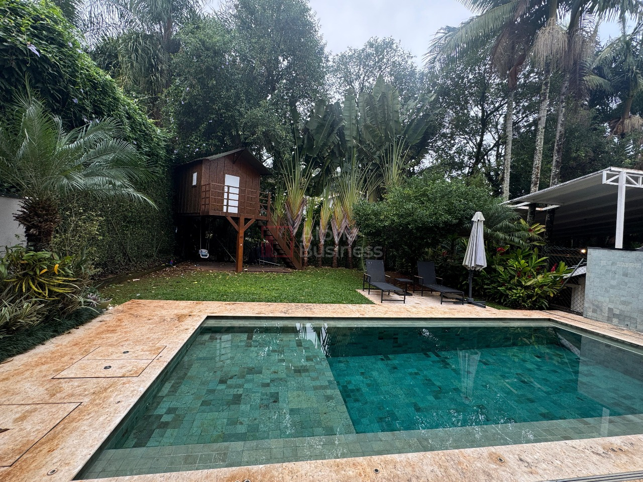 A área externa conta com amplo gramado e uma casa na árvore, criando um espaço de convivência ao ar livre com um toque especial.