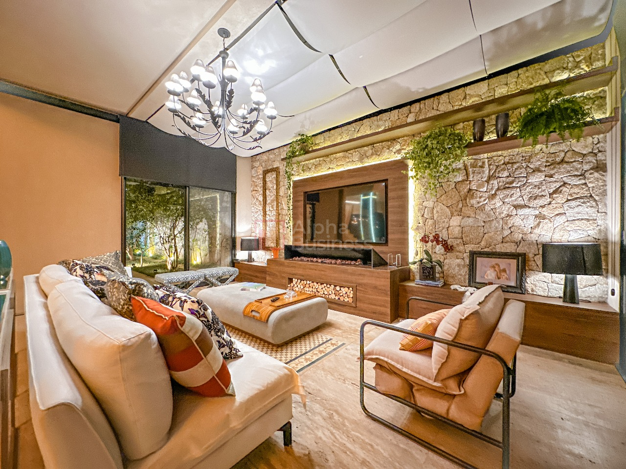 Varanda social com 5 ambientes, mobiliada com peças Entreposto e Artefacto