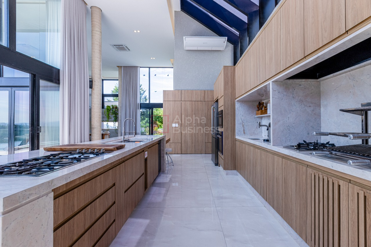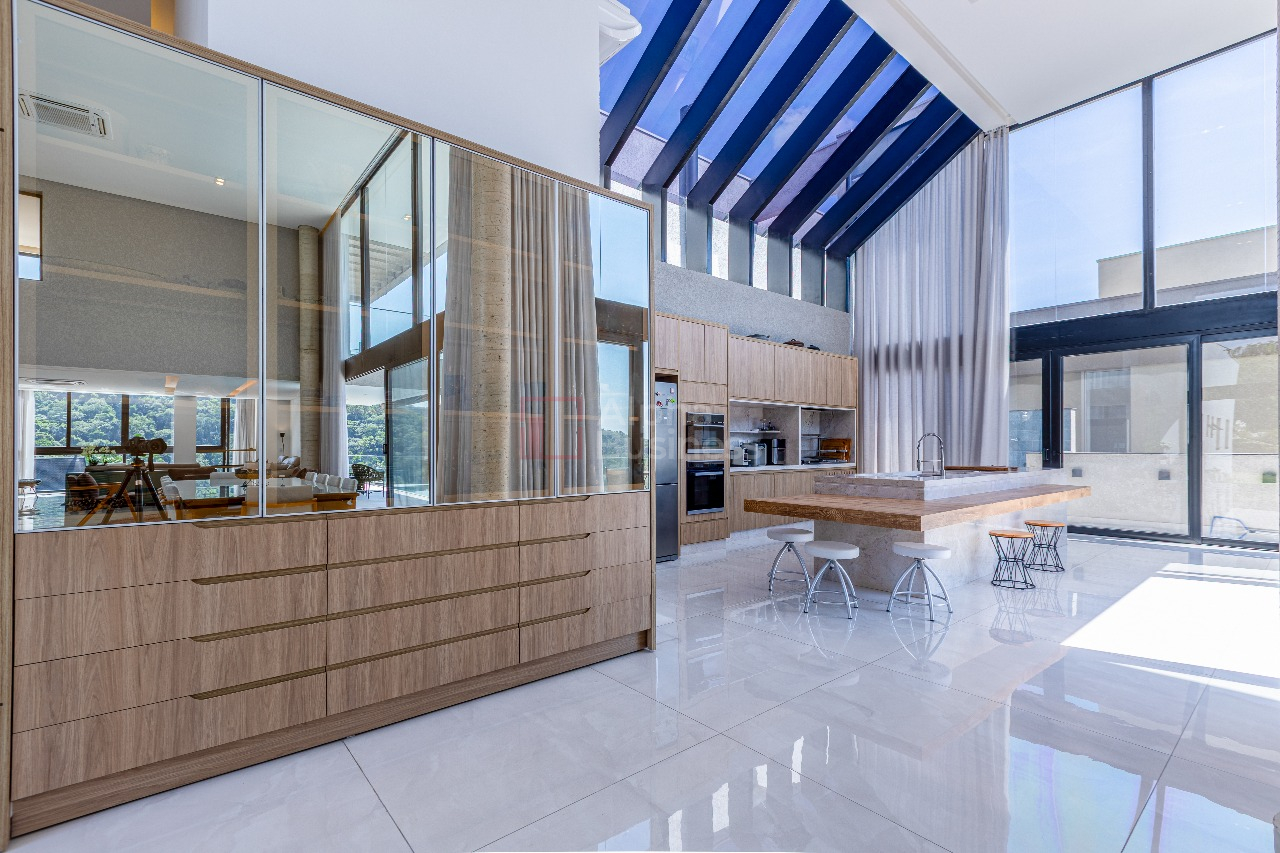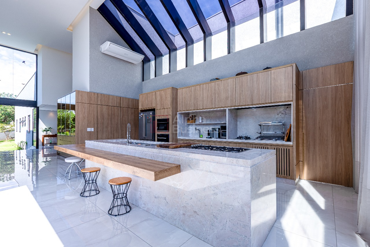 Cozinha com ilha equipada com eletrodomésticos e planejados