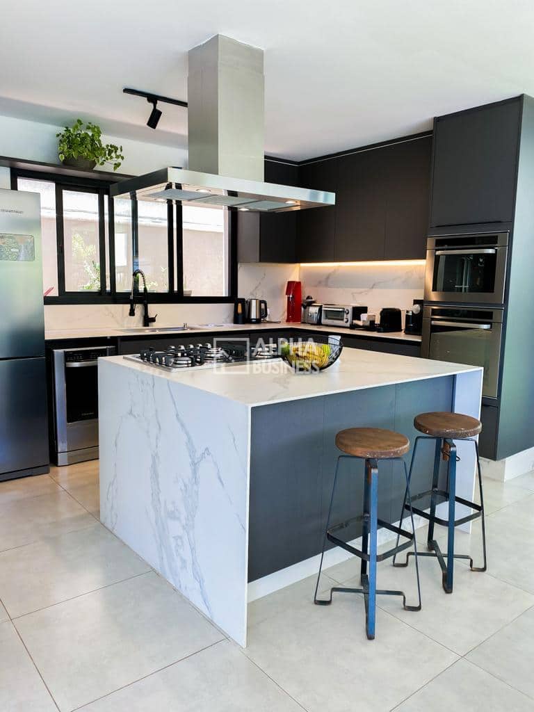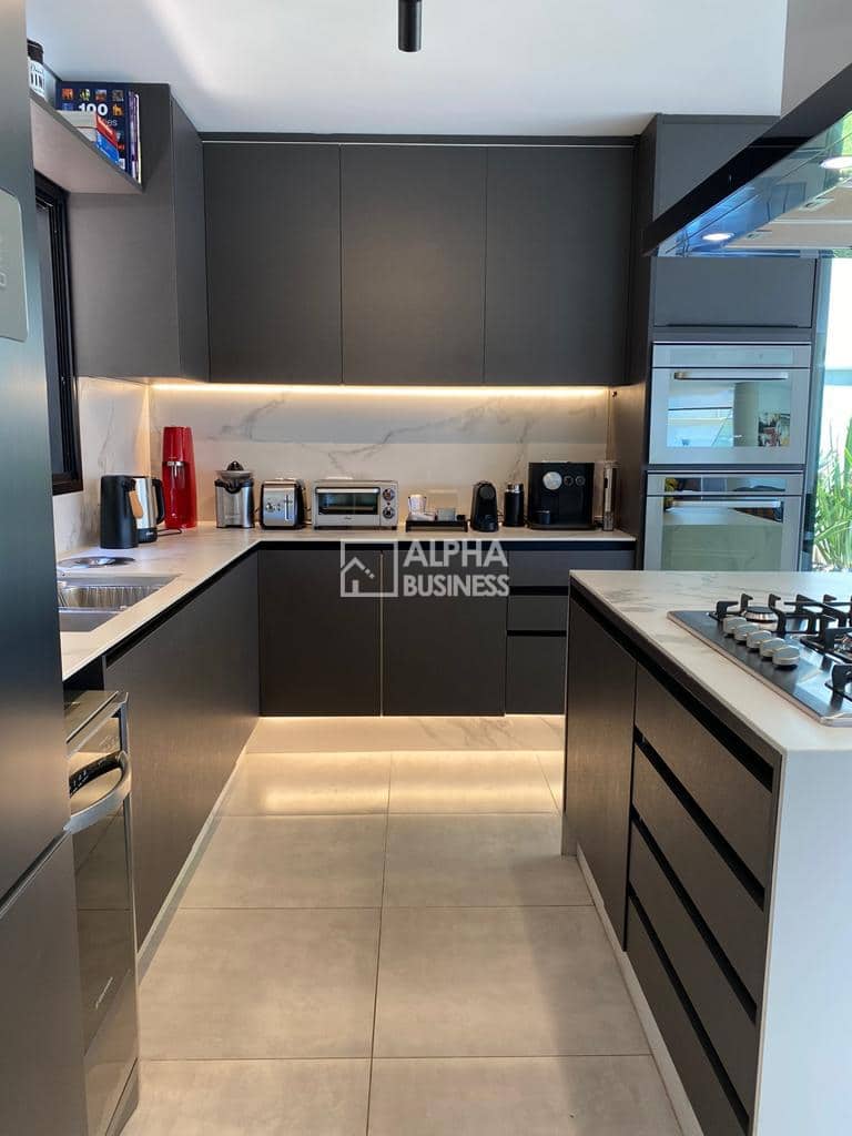 A cozinha é um destaque por si só, com uma ilha central em pedra Calacata, trazendo um toque de luxo e funcionalidade. Equipada com armários da renomada marca Todeschini, oferece amplo espaço para armazenamento e preparação de alimentos. É um espaço perfeito para aqueles que gostam de cozinhar e receber amigos e familiares.