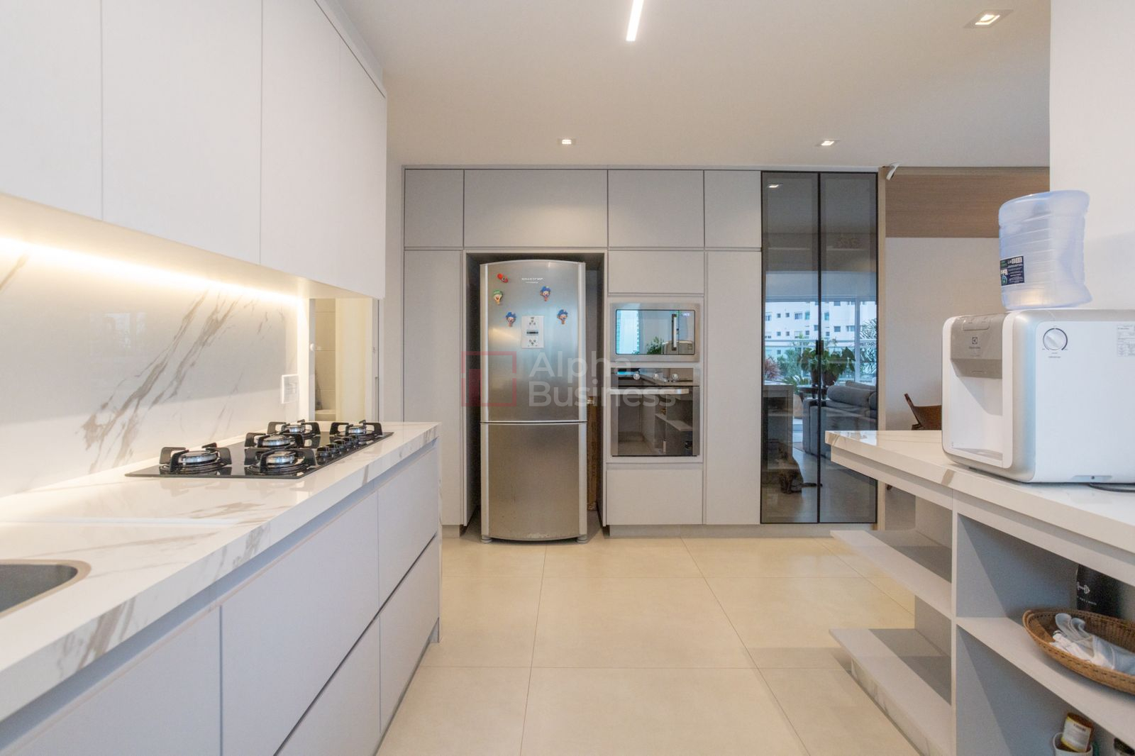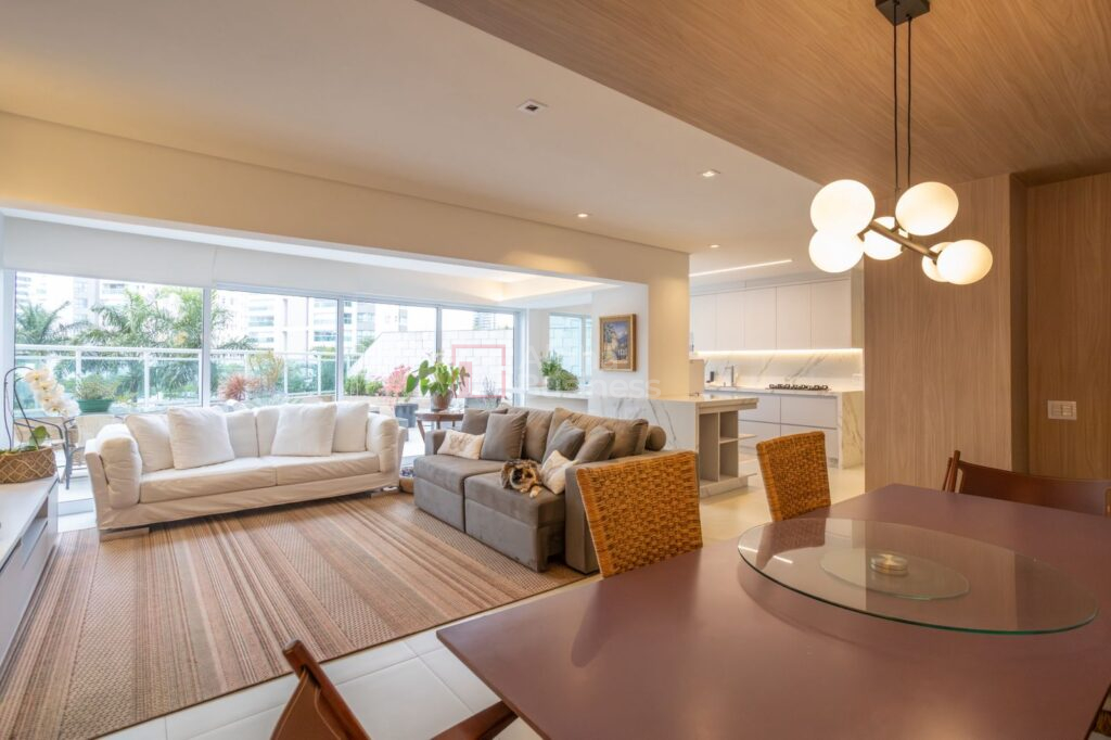Cozinha equipada com marcenaria sob medida, bancadas em pedra nobre e espaço para ilha central