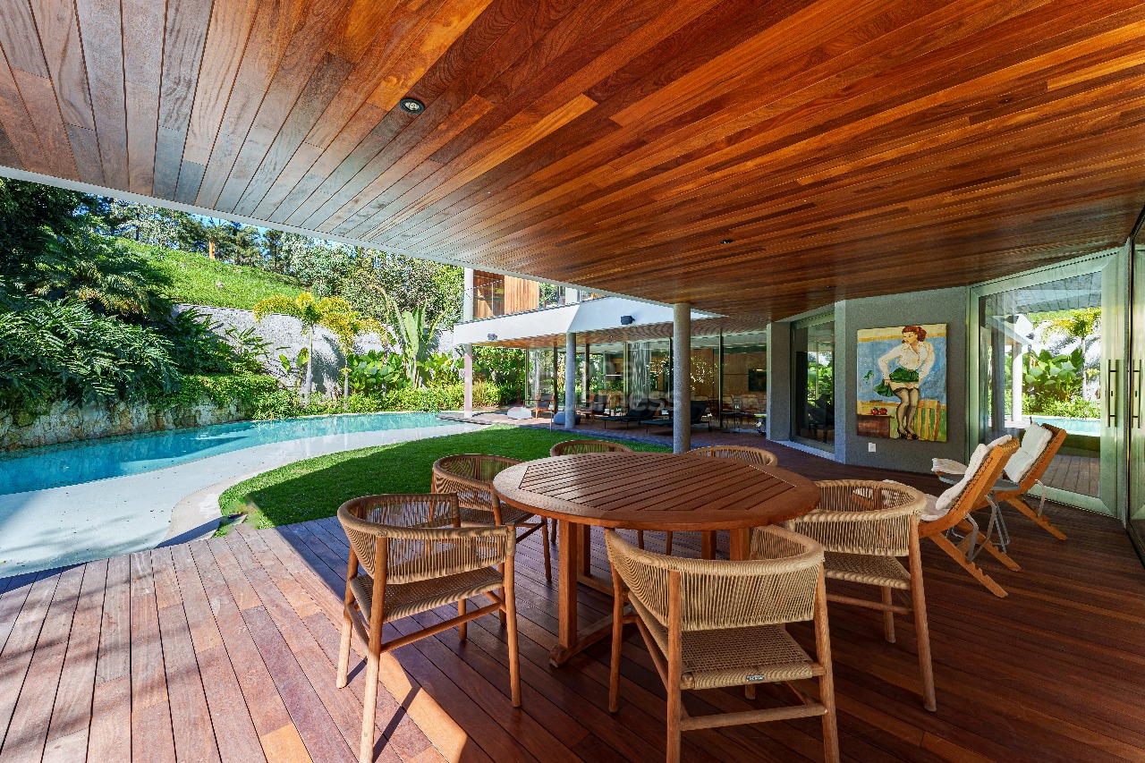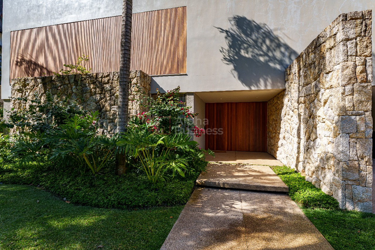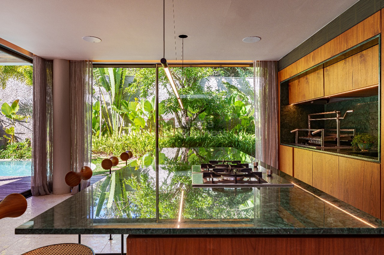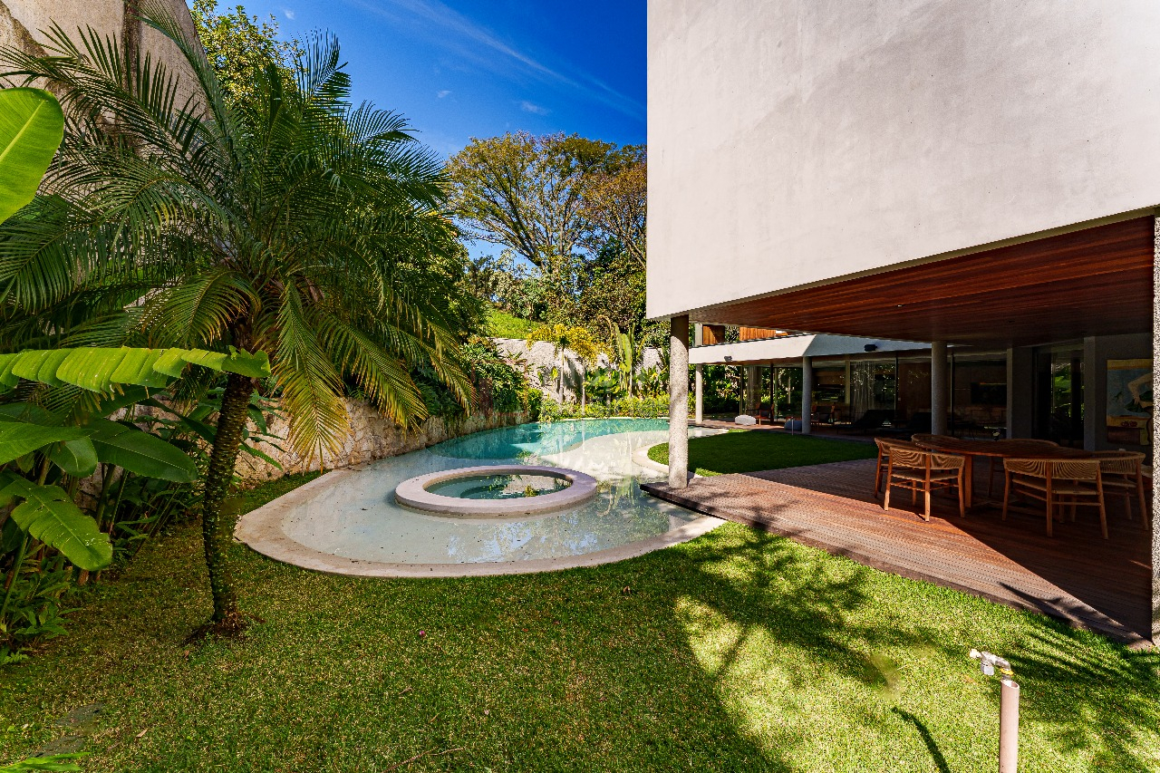 No terreno de 1.191m², destaque para a piscina natural de formato orgânico, equipada com hidromassagem e sistema de aquecimento alimentado por placas solares. Em estilo contemporâneo, a decoração ganha cores sóbrias que variam do cinza claro ao bege das pedras naturais, com alguns destaques em verde para trazer para dentro de casa a natureza exuberante da área externa.