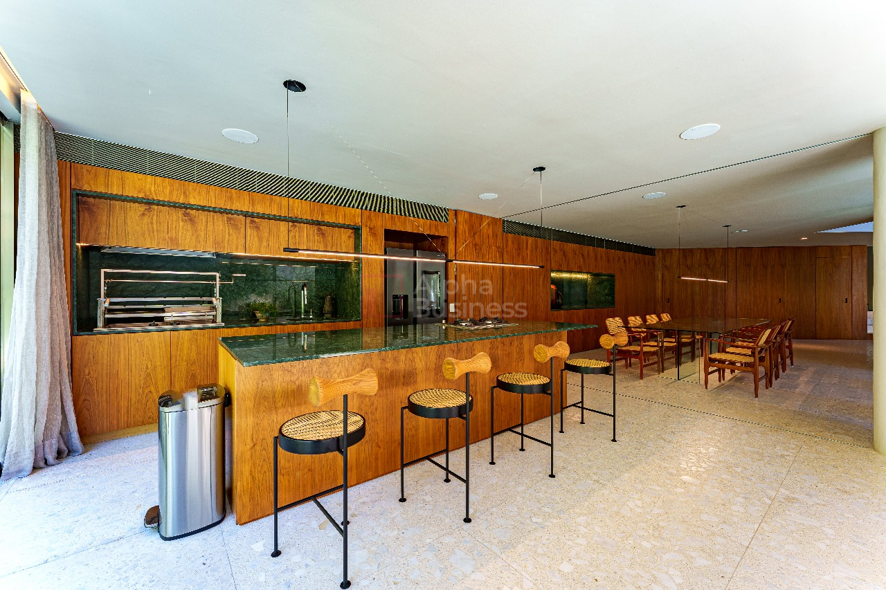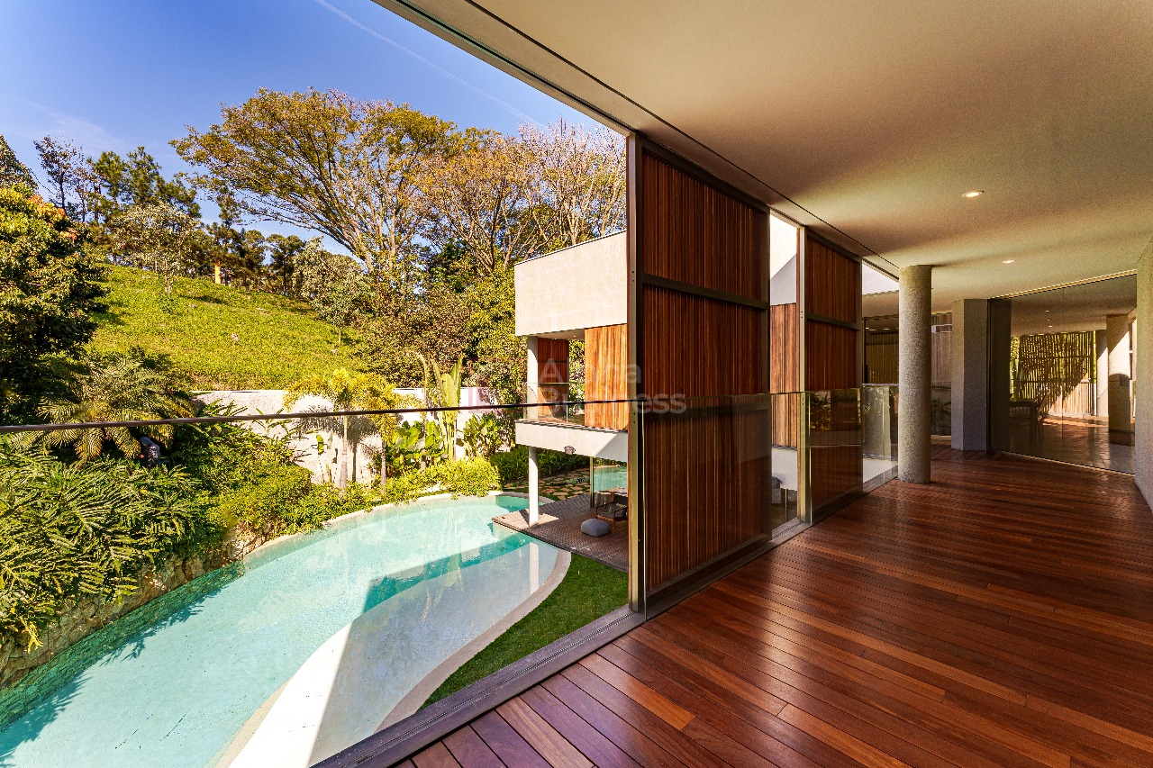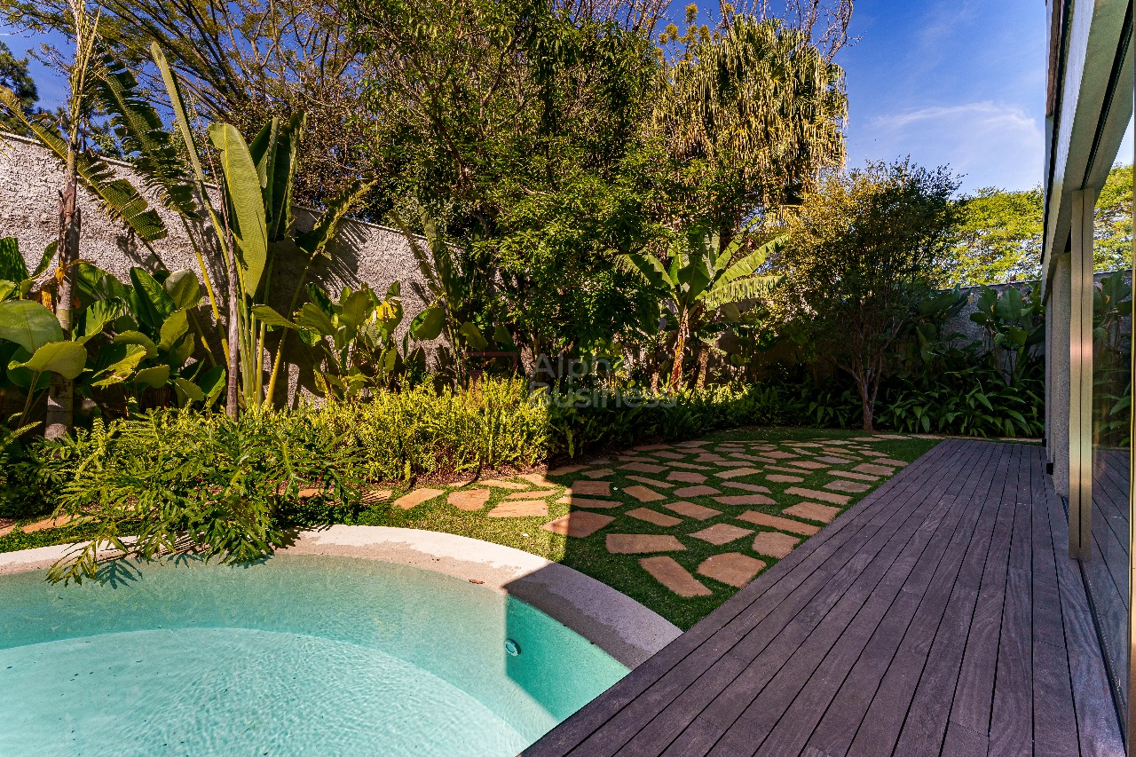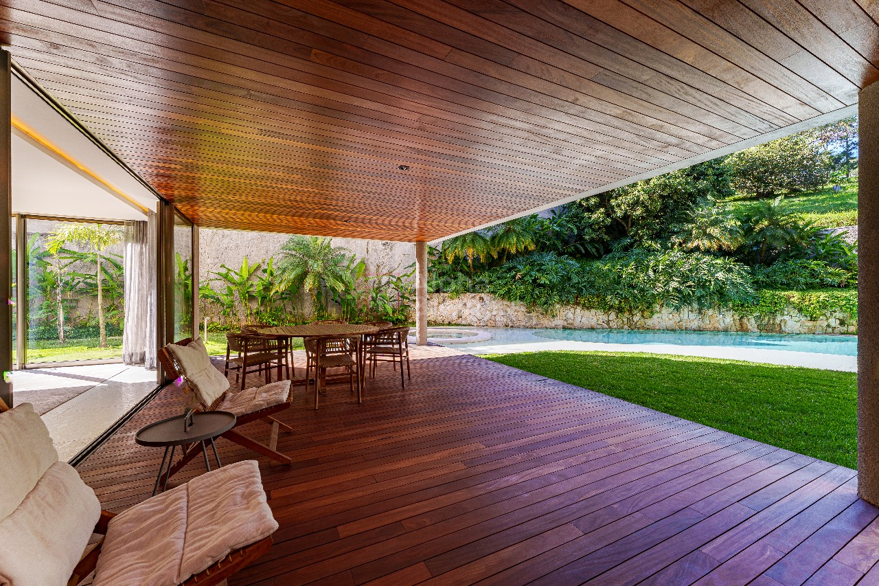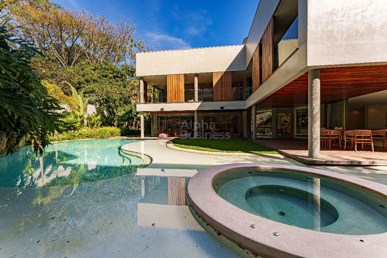 No terreno de 1.191m², destaque para a piscina natural de formato orgânico, equipada com hidromassagem e sistema de aquecimento alimentado por placas solares. Em estilo contemporâneo, a decoração ganha cores sóbrias que variam do cinza claro ao bege das pedras naturais, com alguns destaques em verde para trazer para dentro de casa a natureza exuberante da área externa.