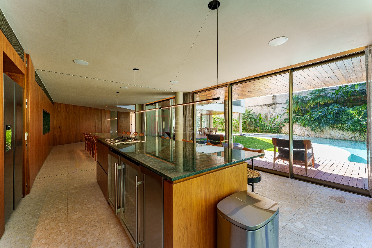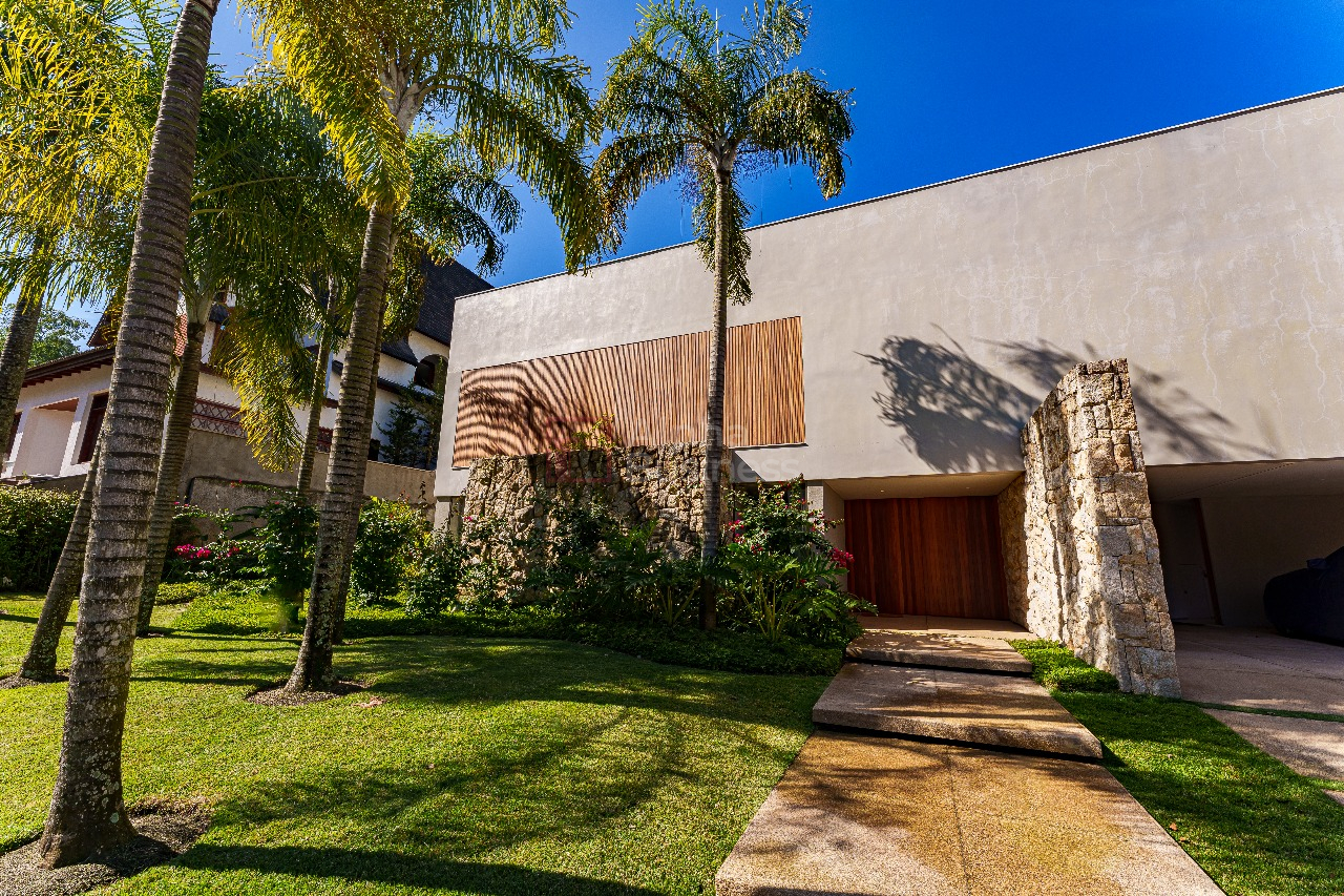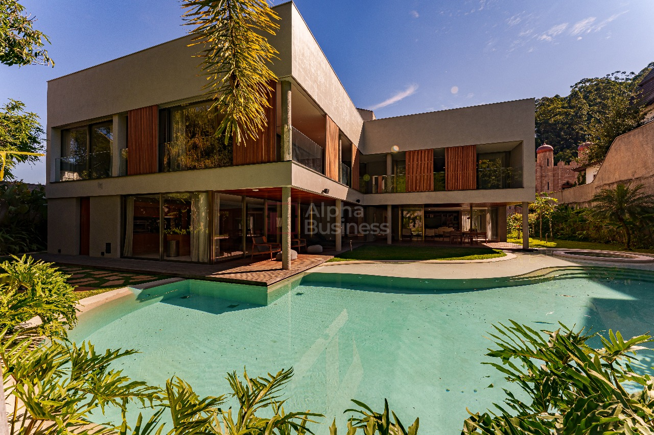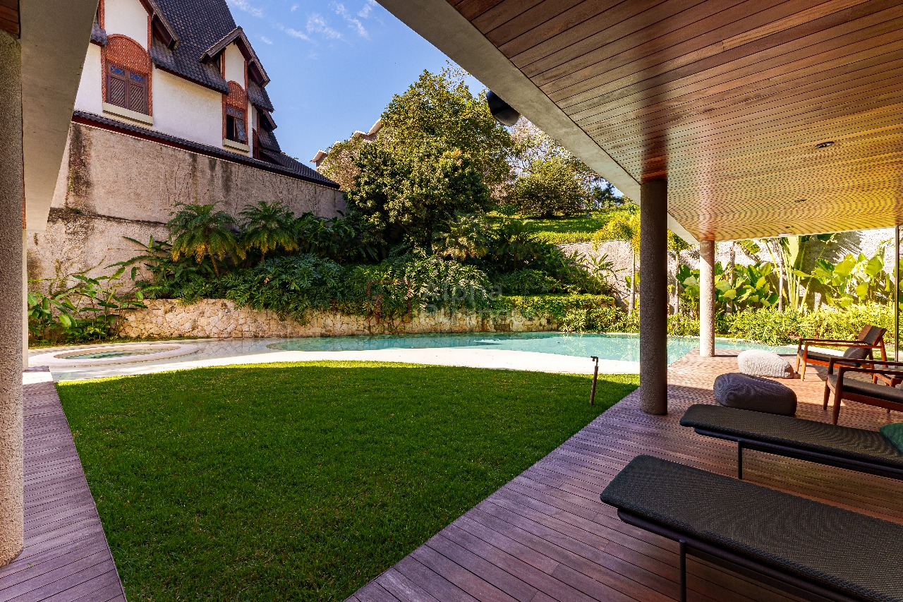 No terreno de 1.191m², destaque para a piscina natural de formato orgânico, equipada com hidromassagem e sistema de aquecimento alimentado por placas solares. Em estilo contemporâneo, a decoração ganha cores sóbrias que variam do cinza claro ao bege das pedras naturais, com alguns destaques em verde para trazer para dentro de casa a natureza exuberante da área externa.