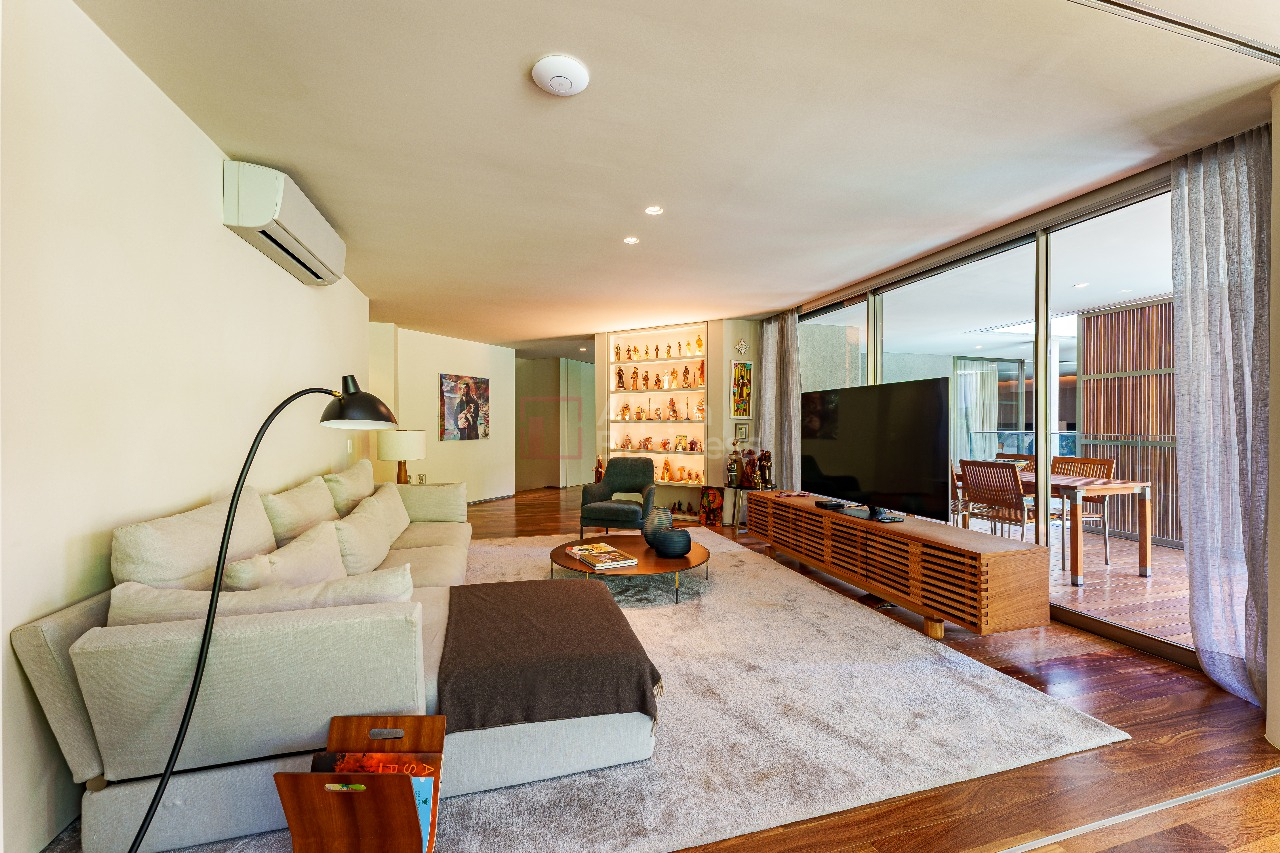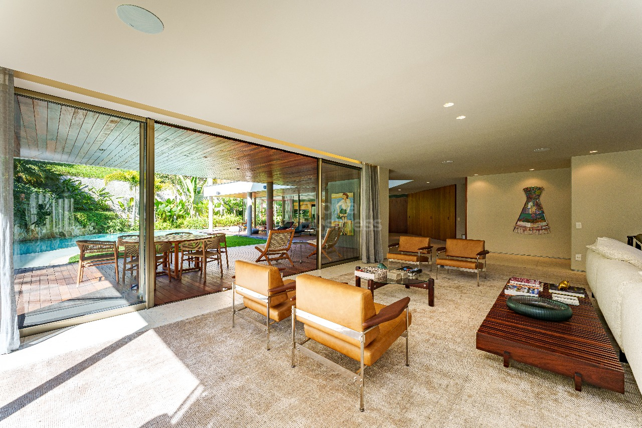 Móveis assinados por Sérgio Rodrigues se destacam em vários ambientes da residência, como as poltronas Beto no living, as cadeiras Oscar na sala de jantar, as cadeiras Beg no escritório e as cadeiras Lúcio na suíte máster. Outros destaques são a poltrona Jangada, de Jean Gillon, na sala de TV e as banquetas laiá, de Gustavo Bittencourt, no espaço gourmet.