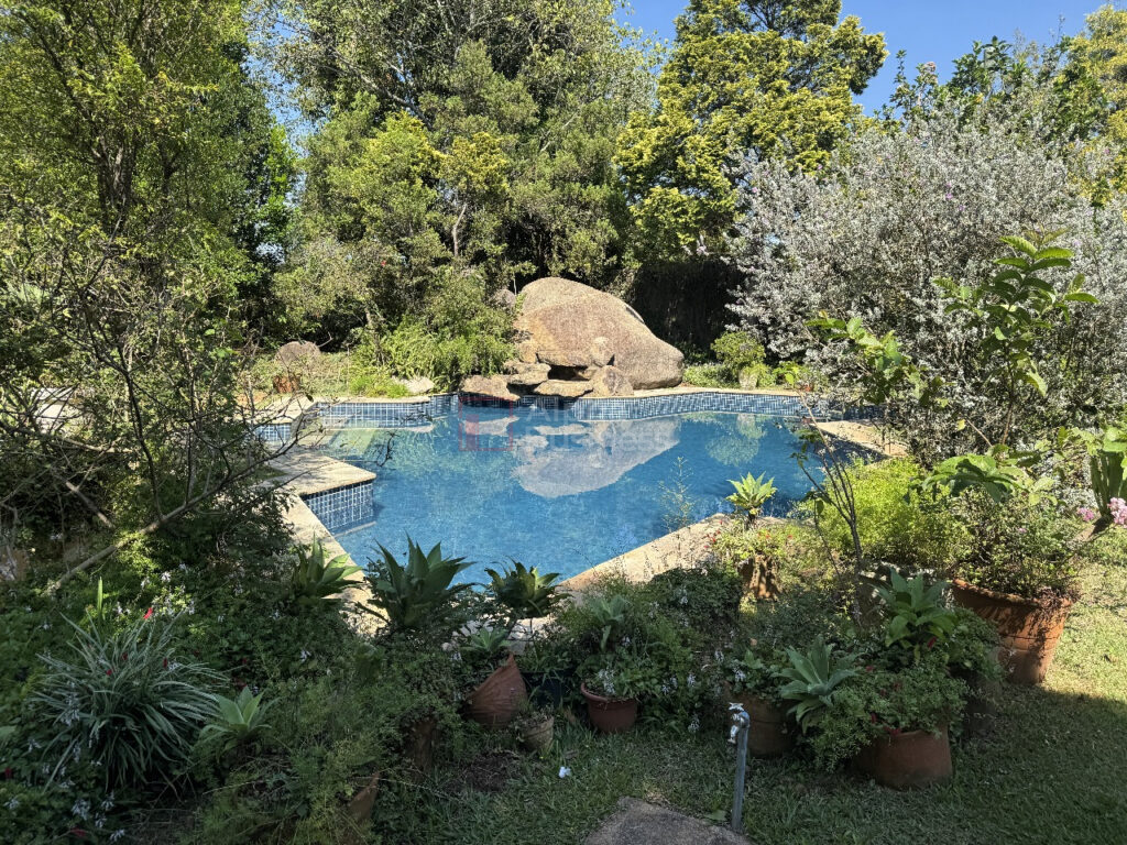Piscina com pedras naturais e integração perfeita ao jardim, compondo um cenário de total privacidade e contato com a natureza.