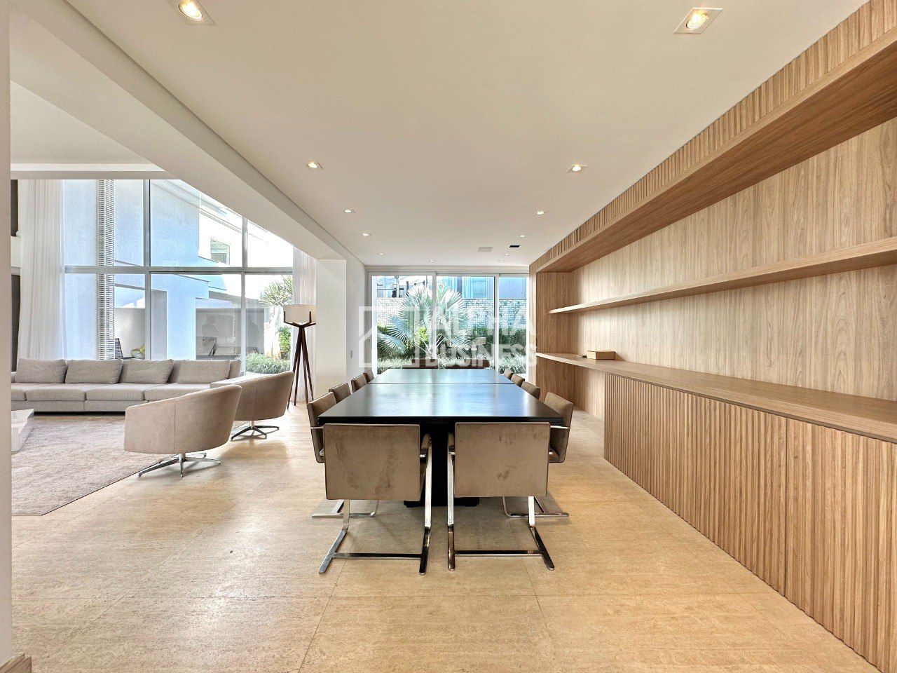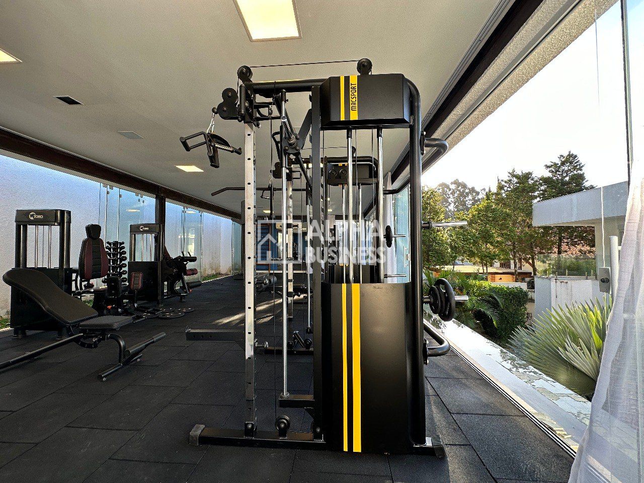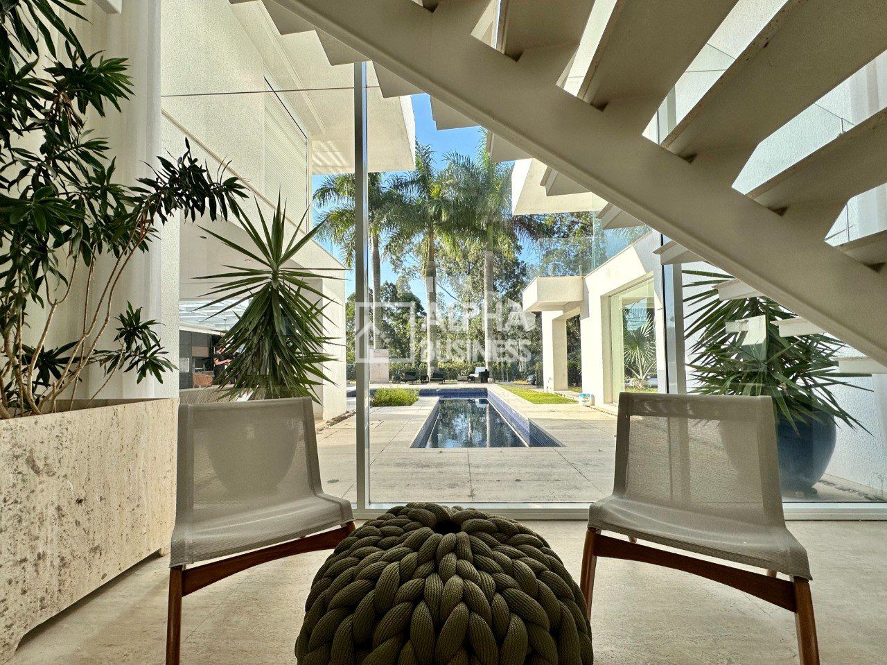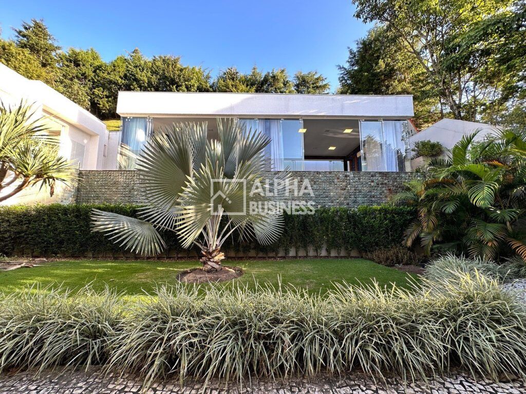 Mansão com projeto moderno e clean que prioriza amplos ambientes e iluminação natural, repleta de vidros, living central com pé direito alto e ambientes integrados, piso romano e de madeira, 5 amplas suítes com ar condicionado e porta persianas automatizadas. A setorização dos ambientes tem uma proposta de grandes vãos para criar ambientes sociais para várias formas de uso e permitir tanto a interação simultânea quanto a privacidade necessária para determinada área.