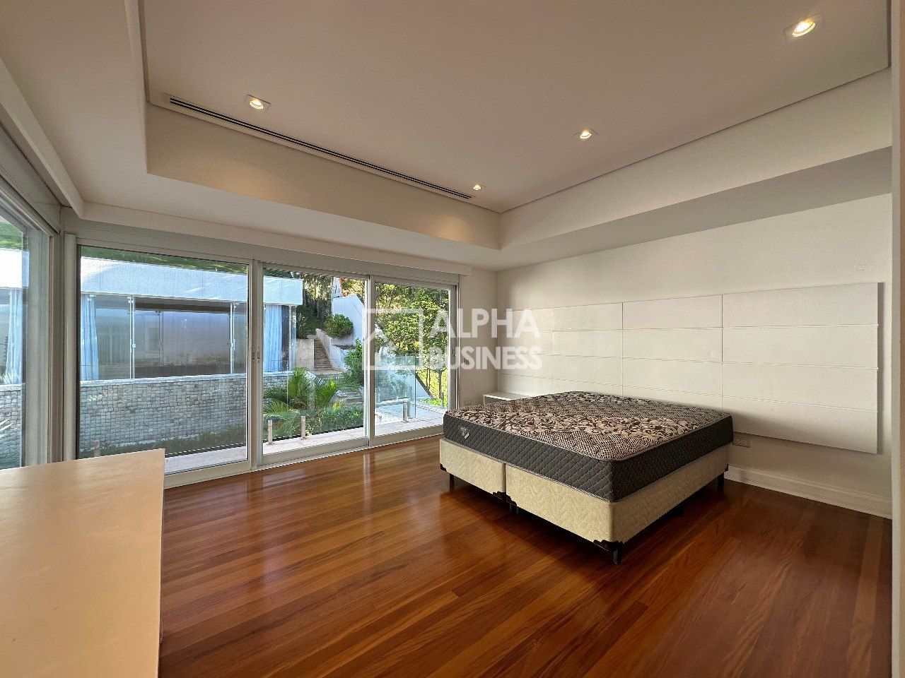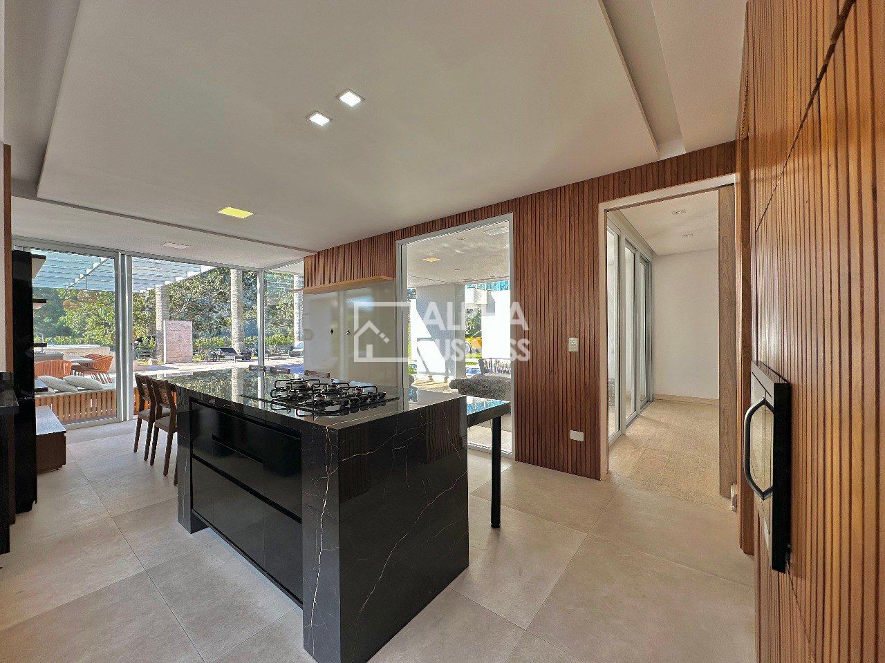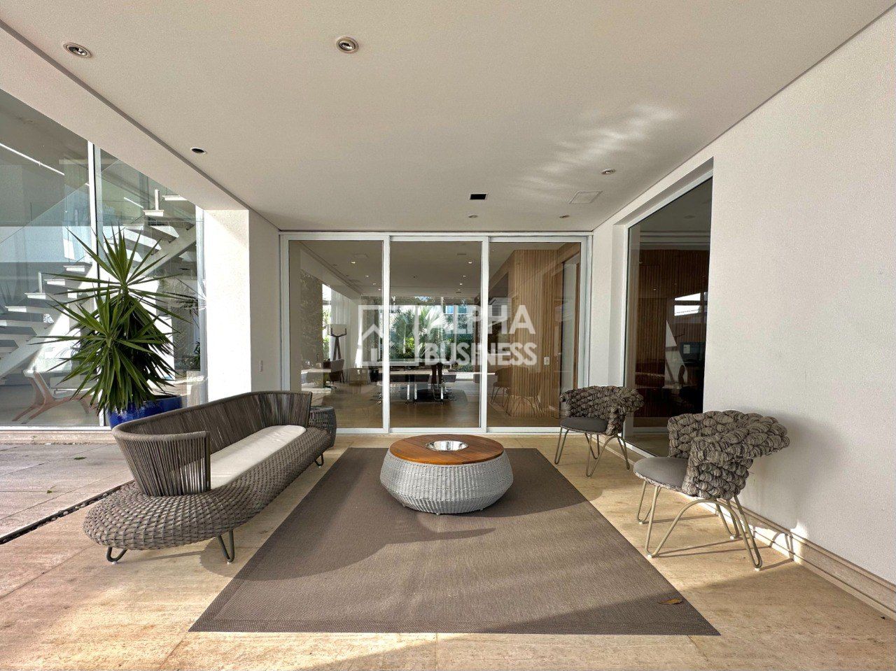 Mansão com projeto moderno e clean que prioriza amplos ambientes e iluminação natural, repleta de vidros, living central com pé direito alto e ambientes integrados, piso romano e de madeira, 5 amplas suítes com ar condicionado e porta persianas automatizadas. A setorização dos ambientes tem uma proposta de grandes vãos para criar ambientes sociais para várias formas de uso e permitir tanto a interação simultânea quanto a privacidade necessária para determinada área.