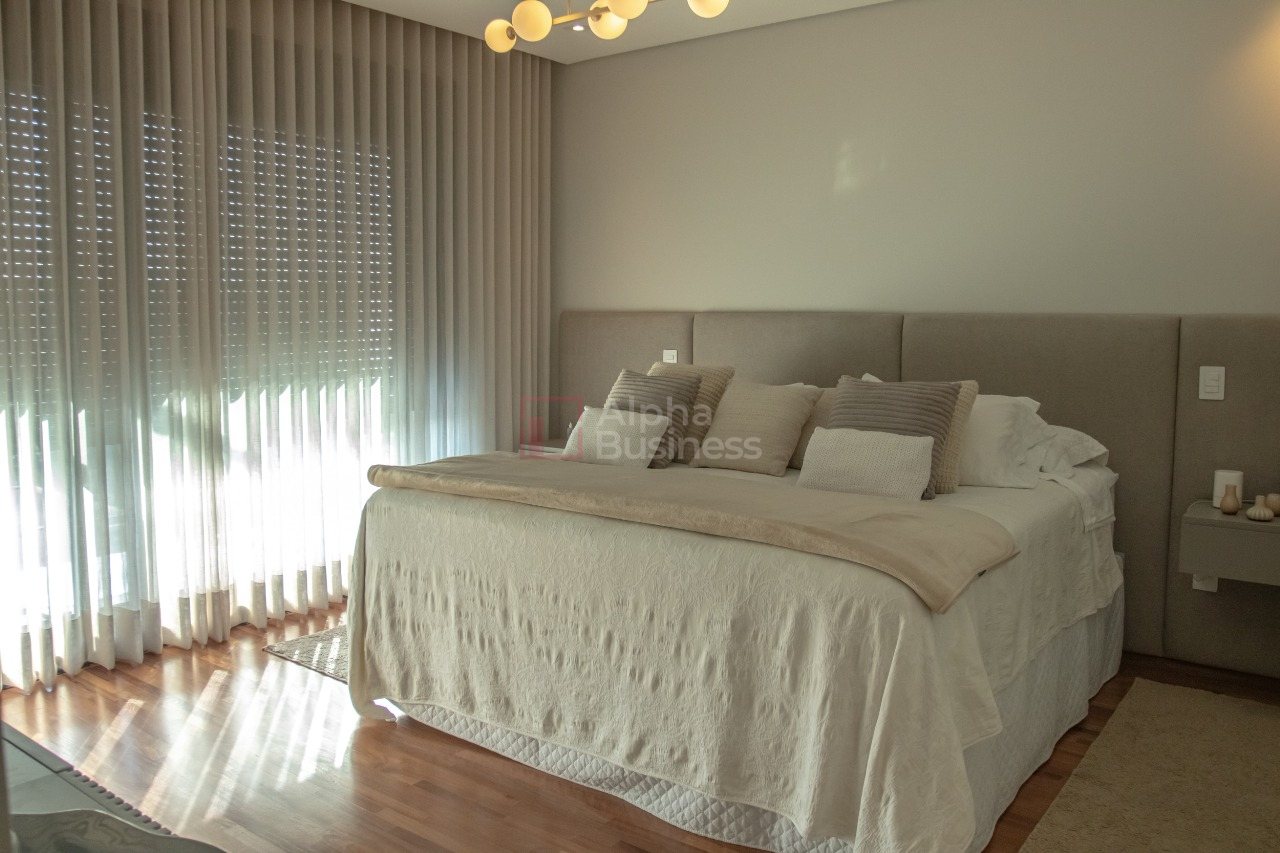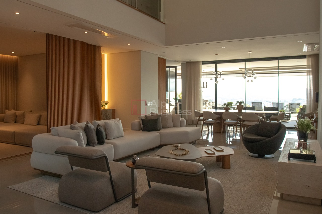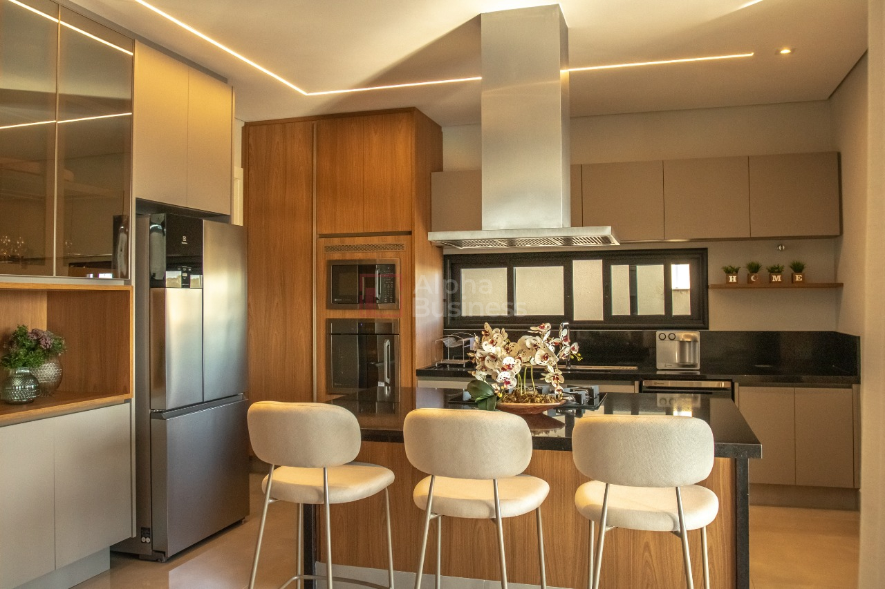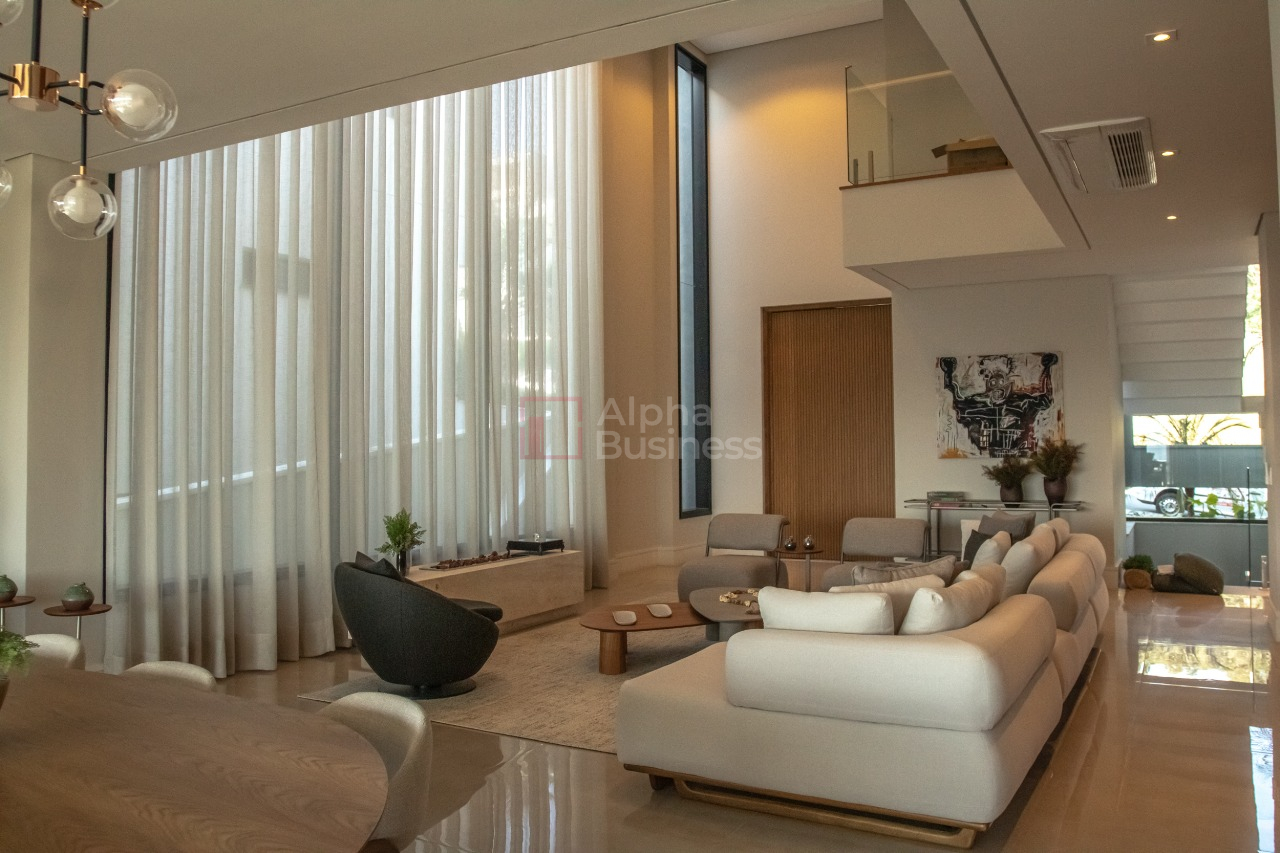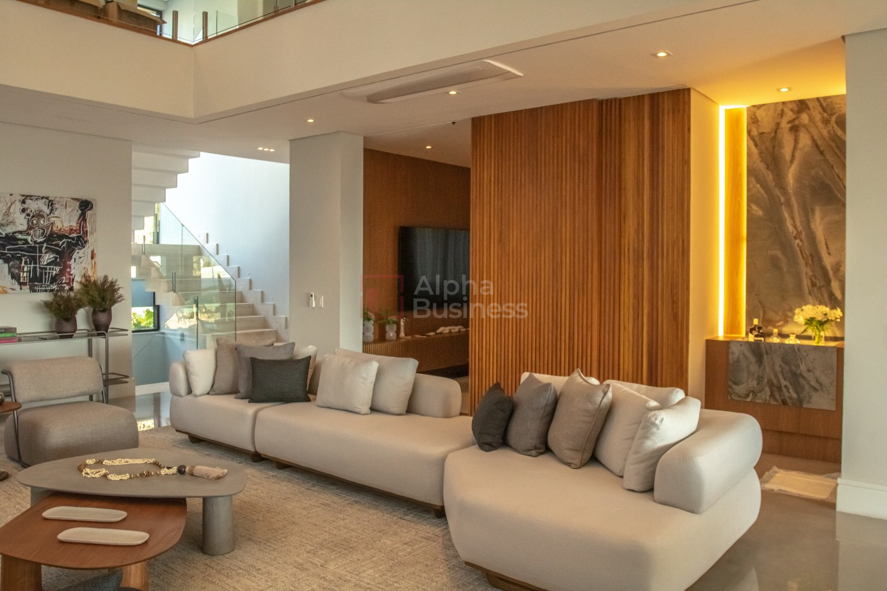 Com planta integrada, o living amplo com pé-direito duplo proporciona muita luminosidade natural e sensação de amplitude. São 4 suítes espaçosas, cozinha com ilha ideal para gourmets, sala de jantar e home theater para momentos de lazer. O imóvel ainda conta com escritório confortável e copa de apoio no piso superior.