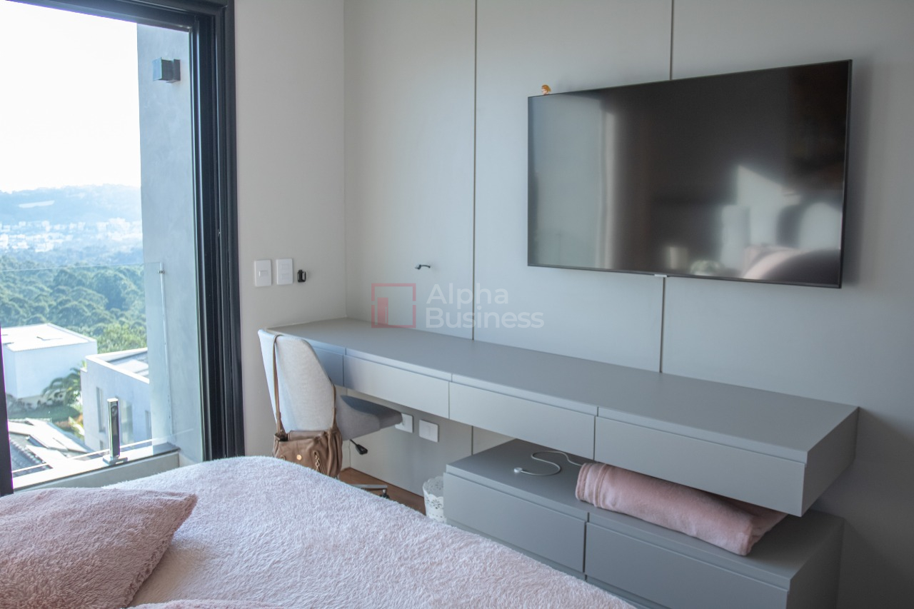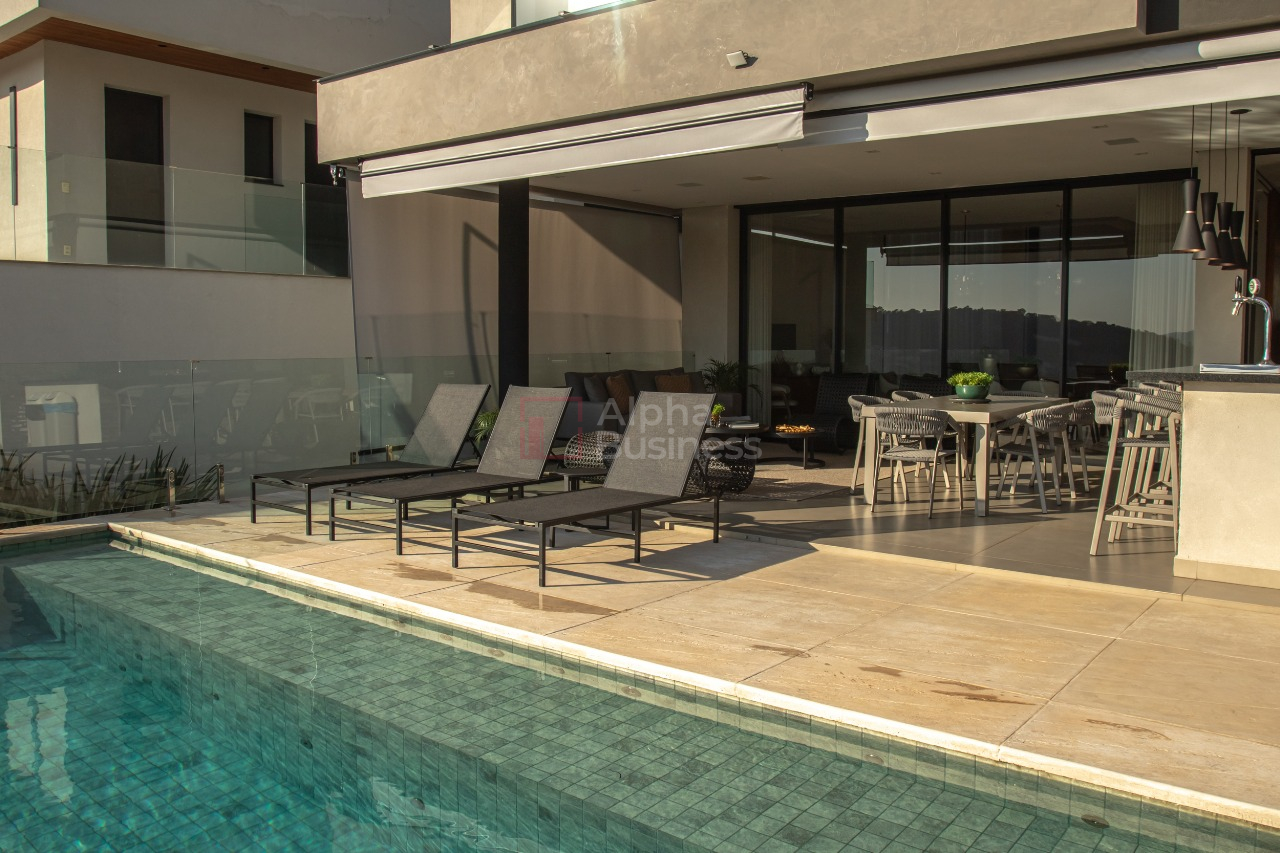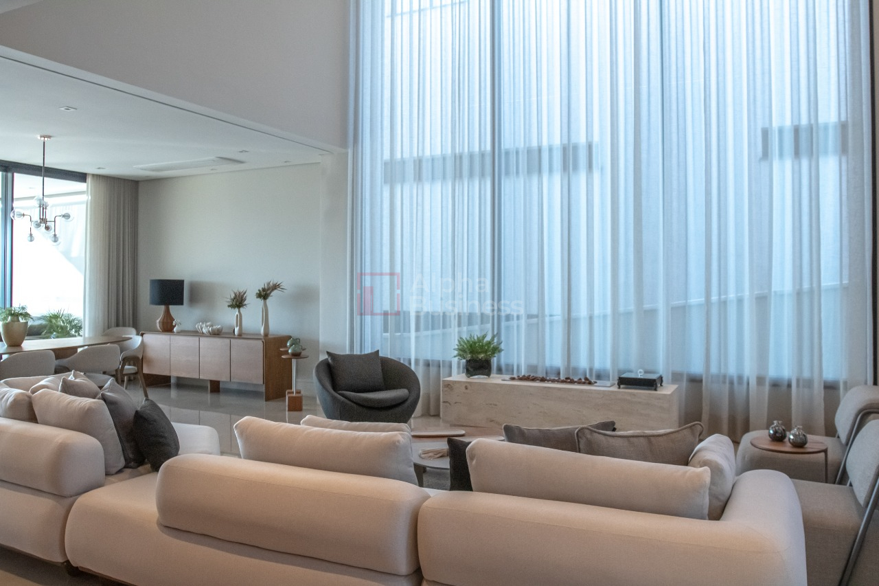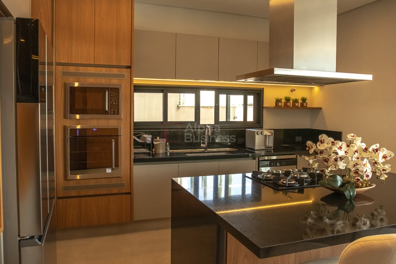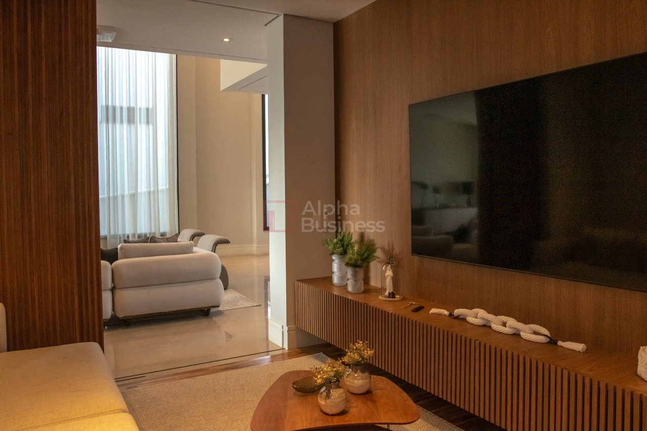Com planta integrada, o living amplo com pé-direito duplo proporciona muita luminosidade natural e sensação de amplitude. São 4 suítes espaçosas, cozinha com ilha ideal para gourmets, sala de jantar e home theater para momentos de lazer. O imóvel ainda conta com escritório confortável e copa de apoio no piso superior.