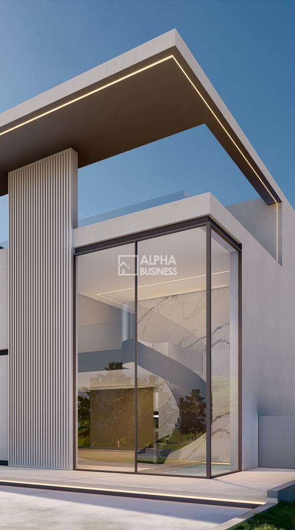 Esta residência moderna localizada no Tamboré II, destaque-se pelo uso da assimetria, balanços e diferentes contrastes que tornam o projeto grandioso. Sua fachada em tons de cinza com alguns elementos arquitetônicos em contraste mais escuro proporcionando leveza, imponência e sofisticação. Uma residência clean com muito luxo conta com uma escada escultural, jardim vertical, 6 suíte sociais, home theather, piano bar, escritótio privativo, amplo gourmet e no pavimento inferior temos camarim, um super spa coberto com camarim que dá acesso à uma sauna. Seu living com pé direito duplo e vista para a piscina é um dos pontos chaves desse projeto, conta com uma lareira imponente revestida em mármore e extensa linha de fogo.