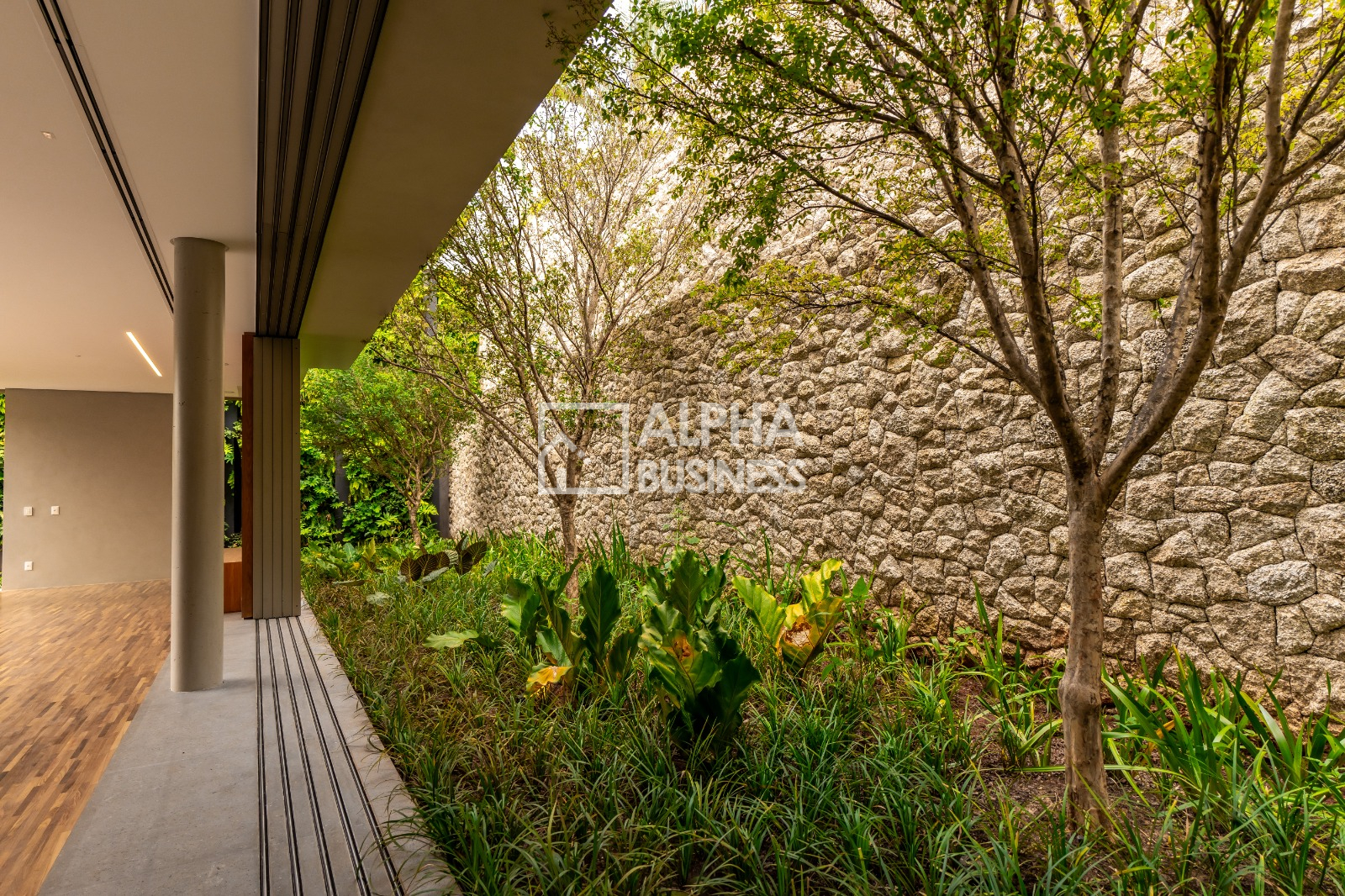 Rodeada por um muro verde de mais de 5.000 vasos, com um sereno muro de pedra ao fundo, a Casa Oave é um refúgio no coração de Alphaville, um respiro em meio ao dinamismo urbano.