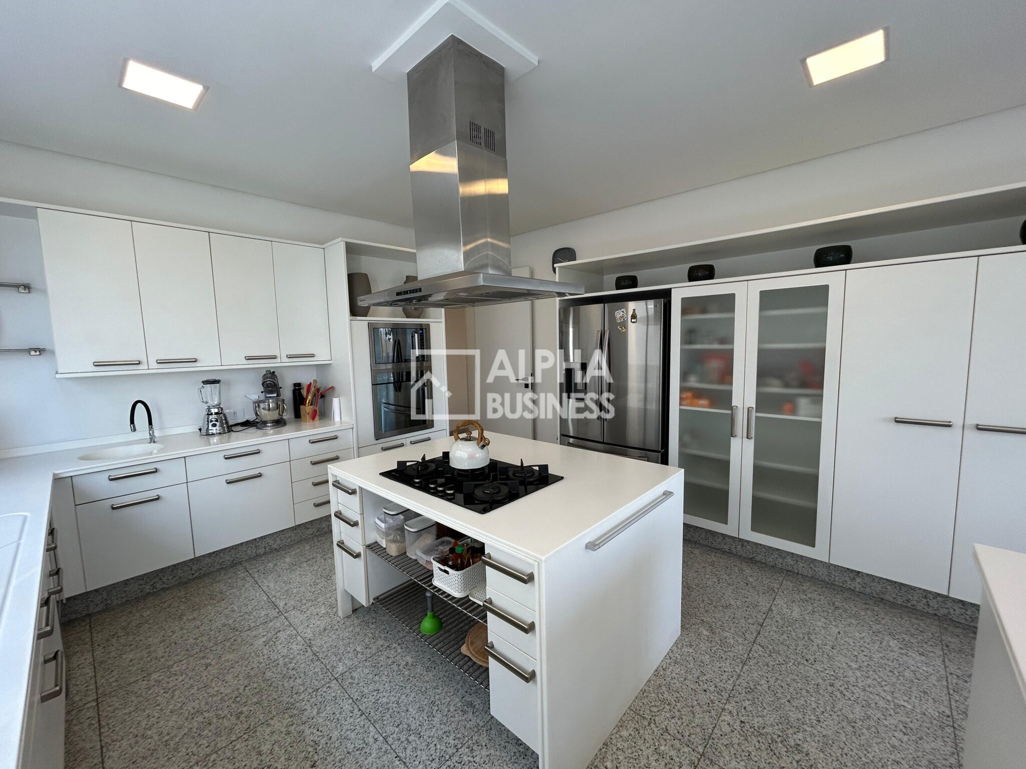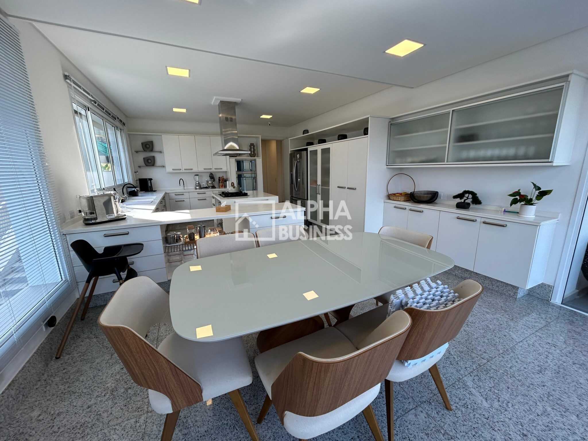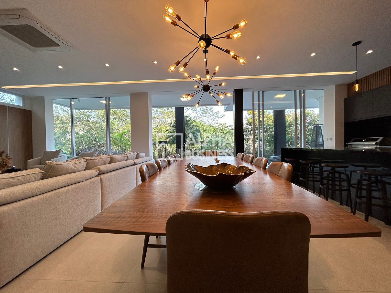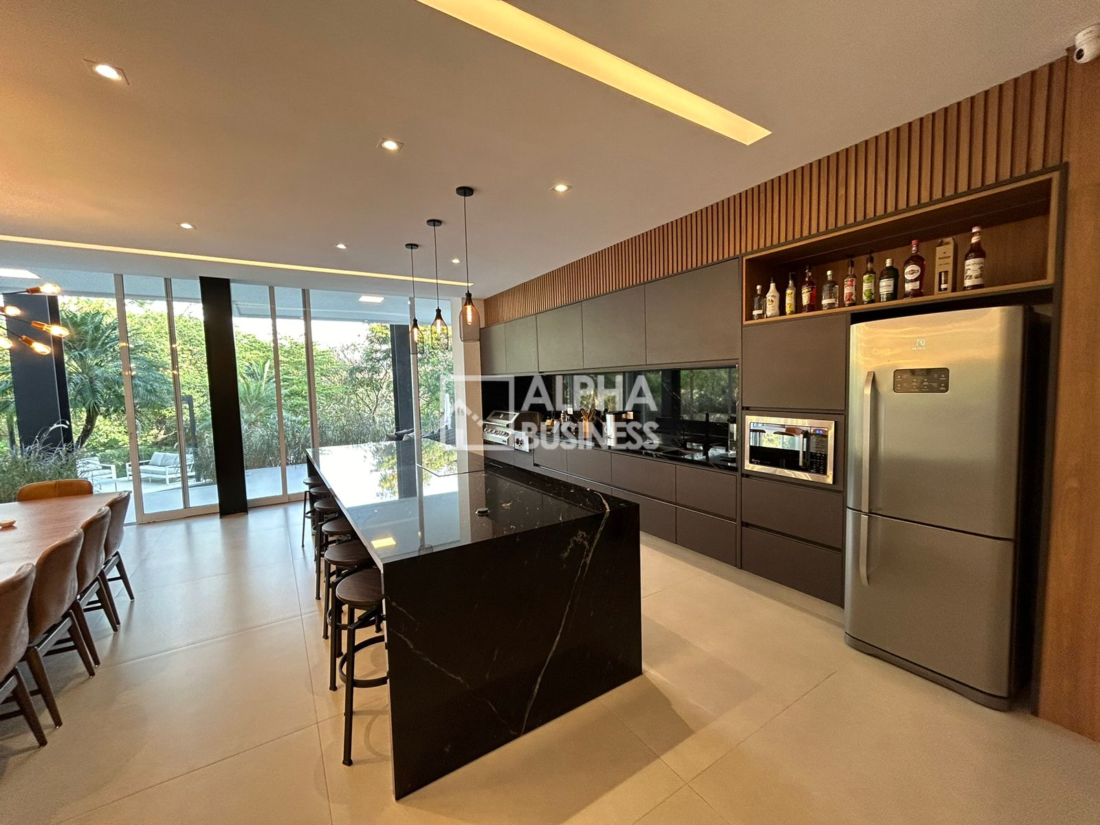 Espaço gourmet com ilha central e ar-condicionado tipo K7