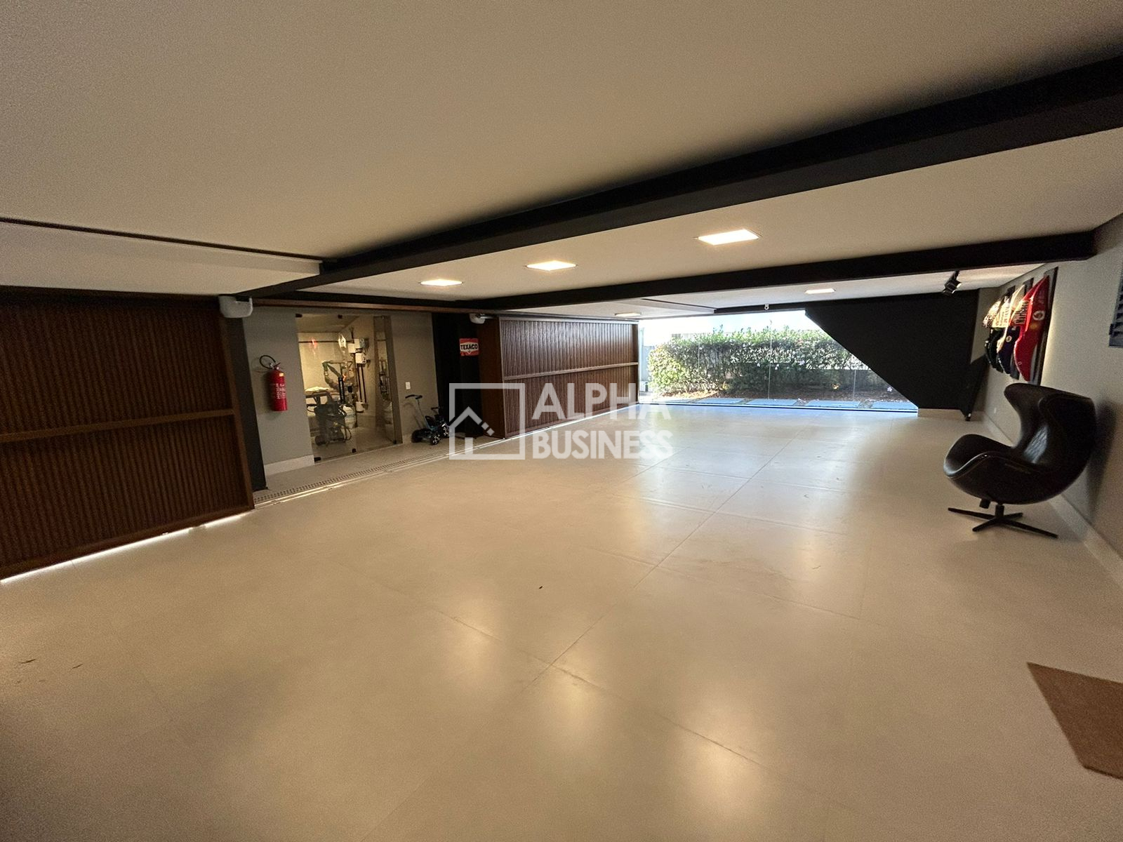 Hall com teto em vidro e mobiliado