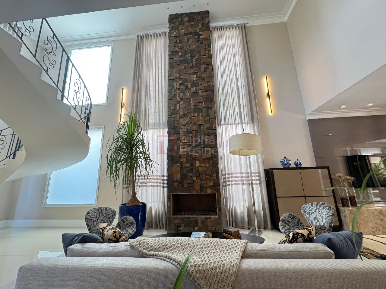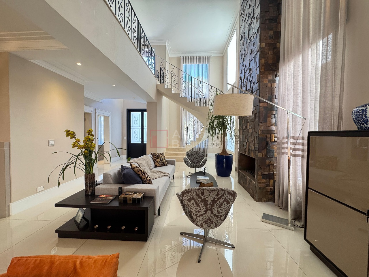 O térreo impressiona com um living de pé-direito duplo, integrado a dois ambientes com lareira, sala de jantar para 8 lugares, lavabo e um escritório completo, com marcenaria sob medida da ID Móveis.