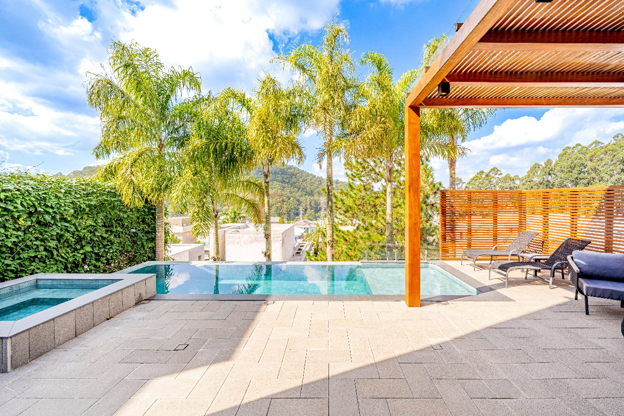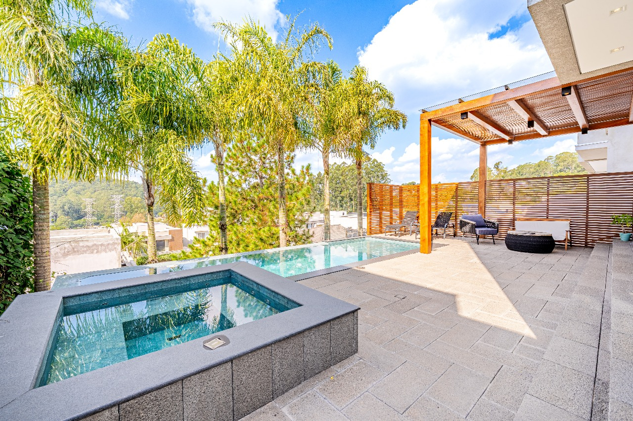 Área de lazer com vista para mata, piscina com prainha e SPA
