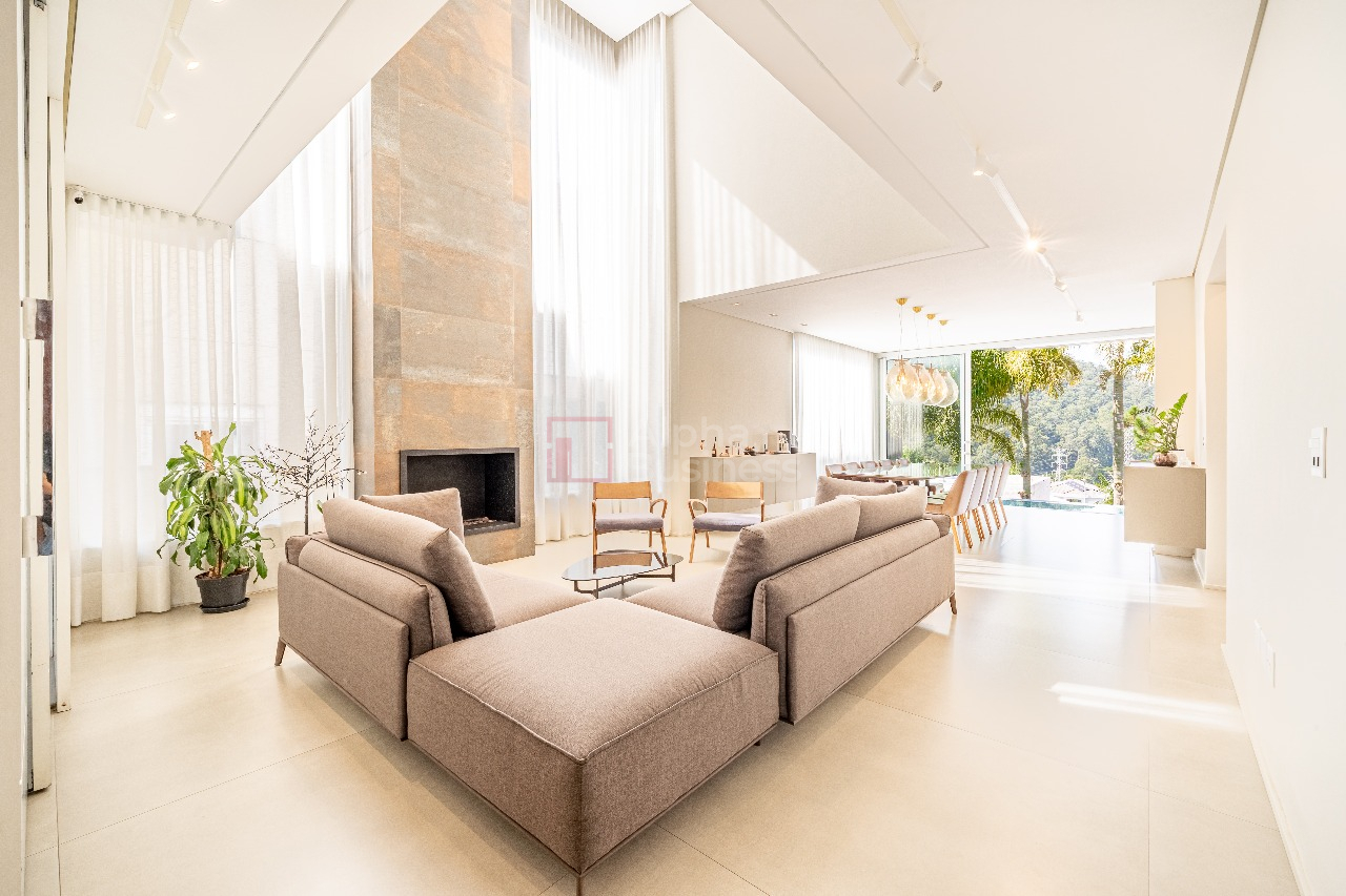 Living para 3 ambientes com sala de estar em pé direito duplo com lareira à gás